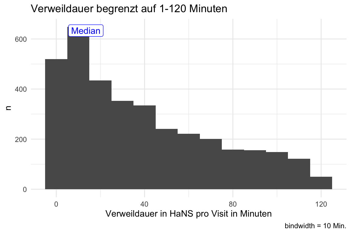 y = Inf, label = "Median", vjust = 1.5, color = "blue")4.7.3 Zeitdauer begrenzt auf 1-120 Min.
