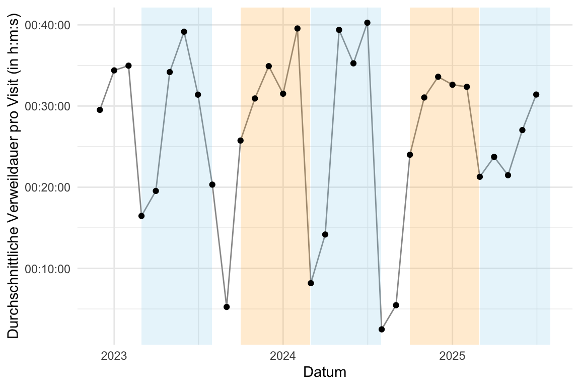 labs(x = "Datum", y = "Durchschnittliche Verweildauer pro Visit (in h:m:s)") +