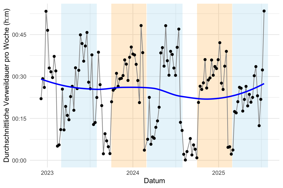 labs(x = "Datum", y = "Durchschnittliche Verweildauer pro Woche (h:m)") +