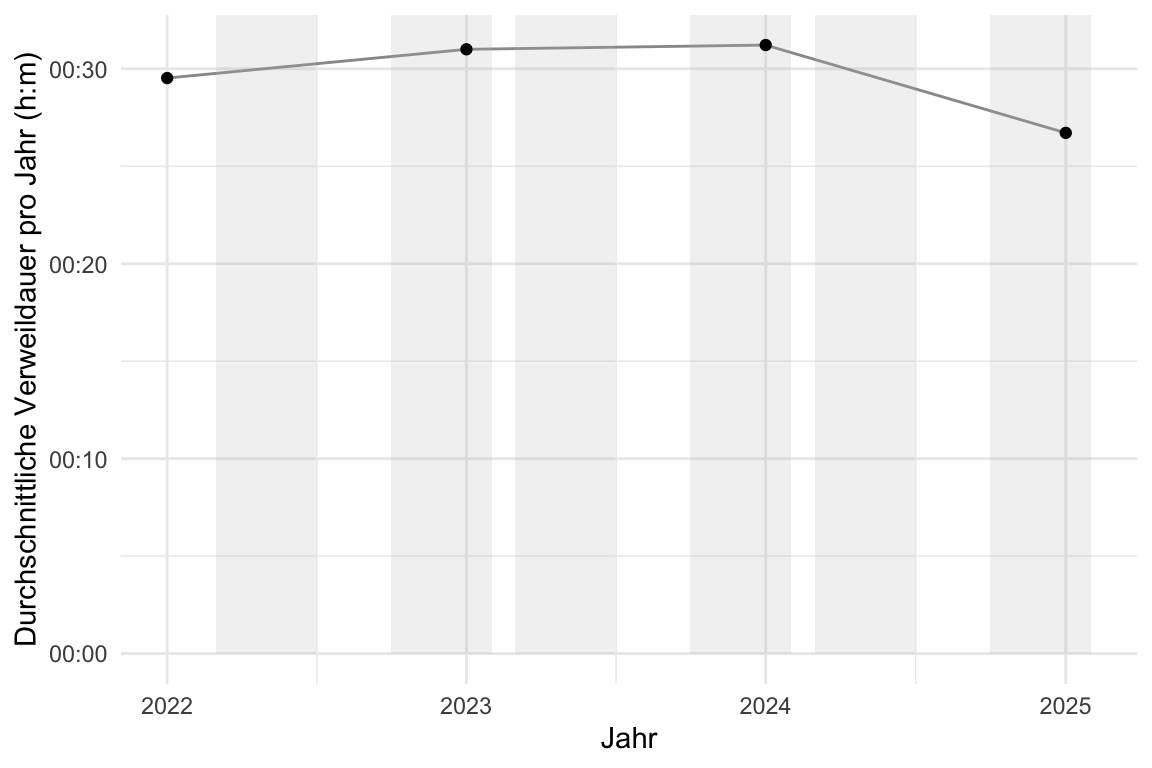 labs(x = "Jahr", y = "Durchschnittliche Verweildauer pro Jahr (h:m)")Show the code