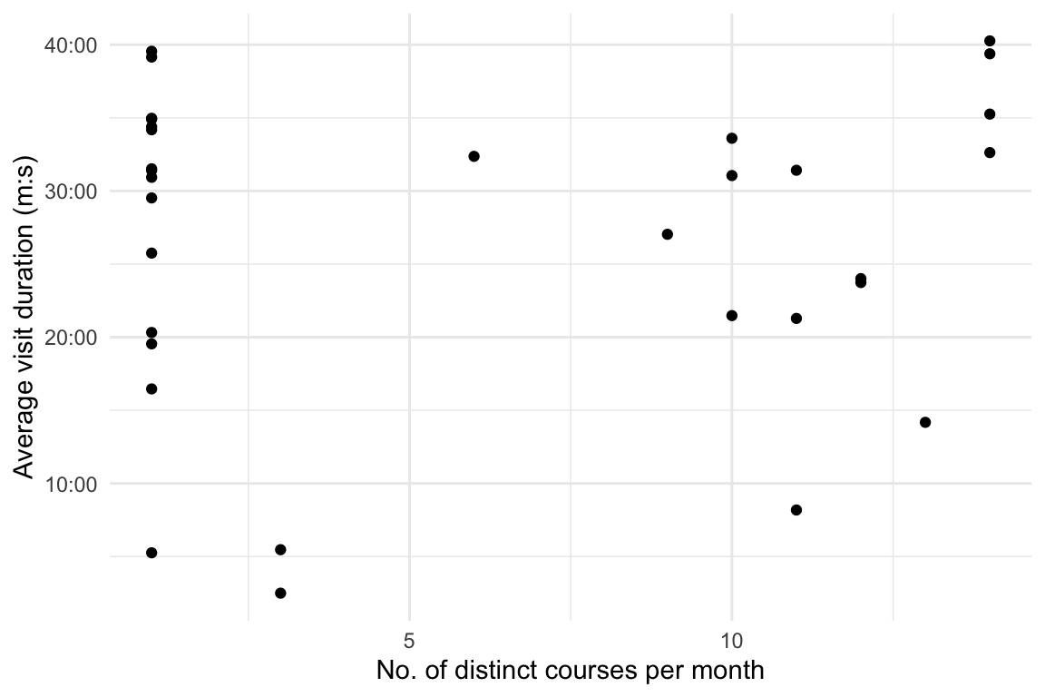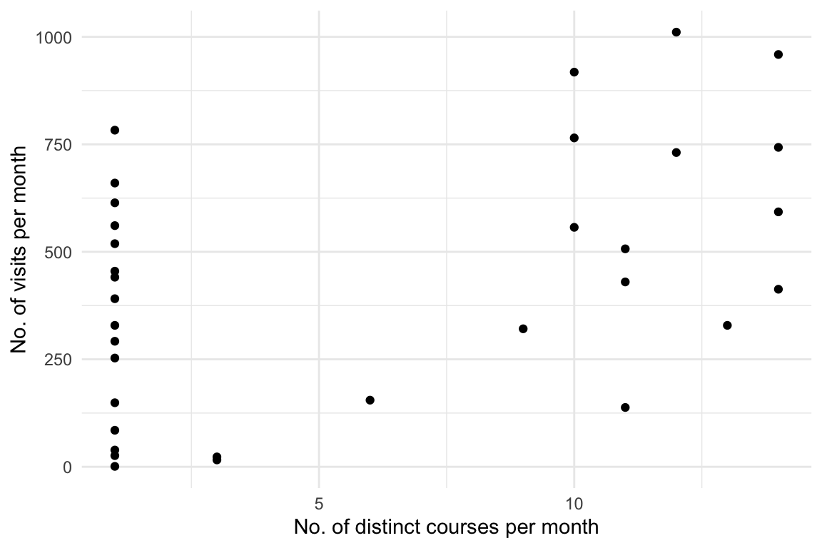 labs(y = "No. of visits per month", x = "No. of distinct courses per month")