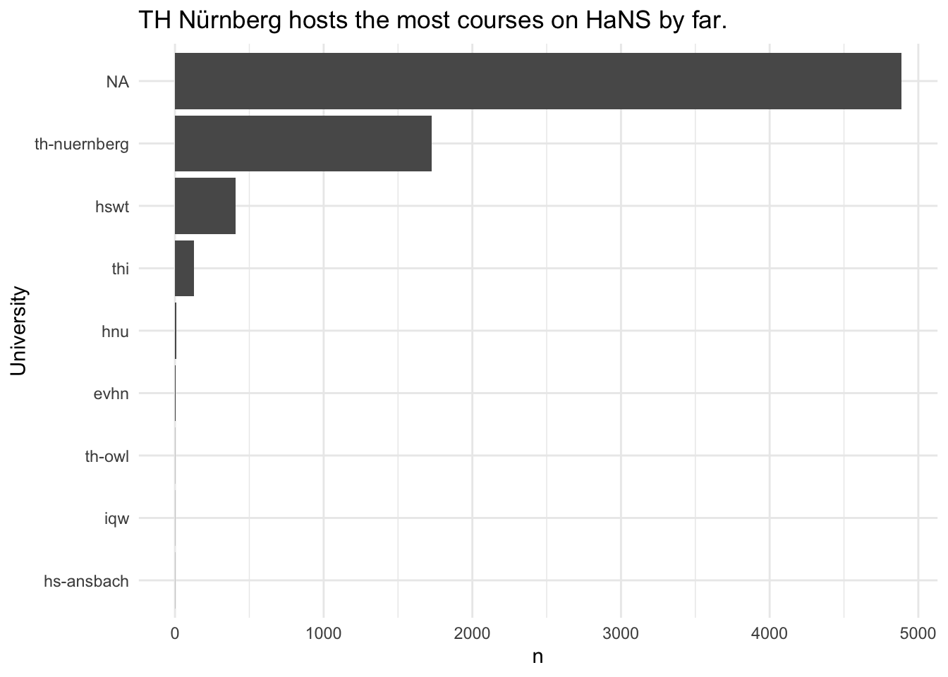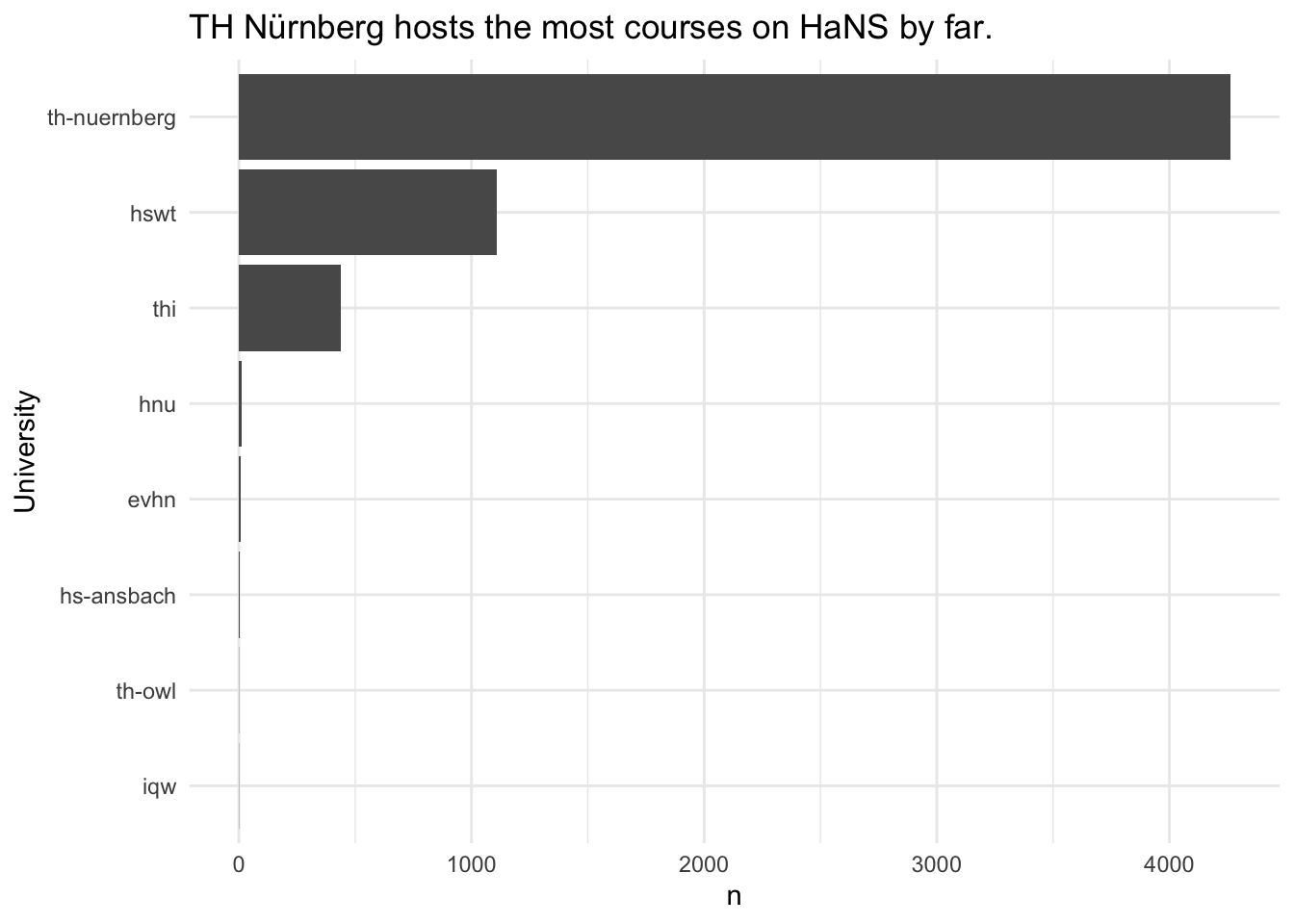 course_and_uni_per_visit|>distinct(fingerprint, .keep_all =TRUE)|>count(university)|>ggplot(aes(y =reorder(university, n), x =n))+geom_col()+theme_minimal()+labs( title ="TH Nürnberg hosts the most courses on HaNS by far.", y ="University")