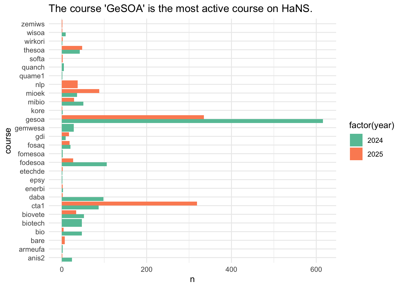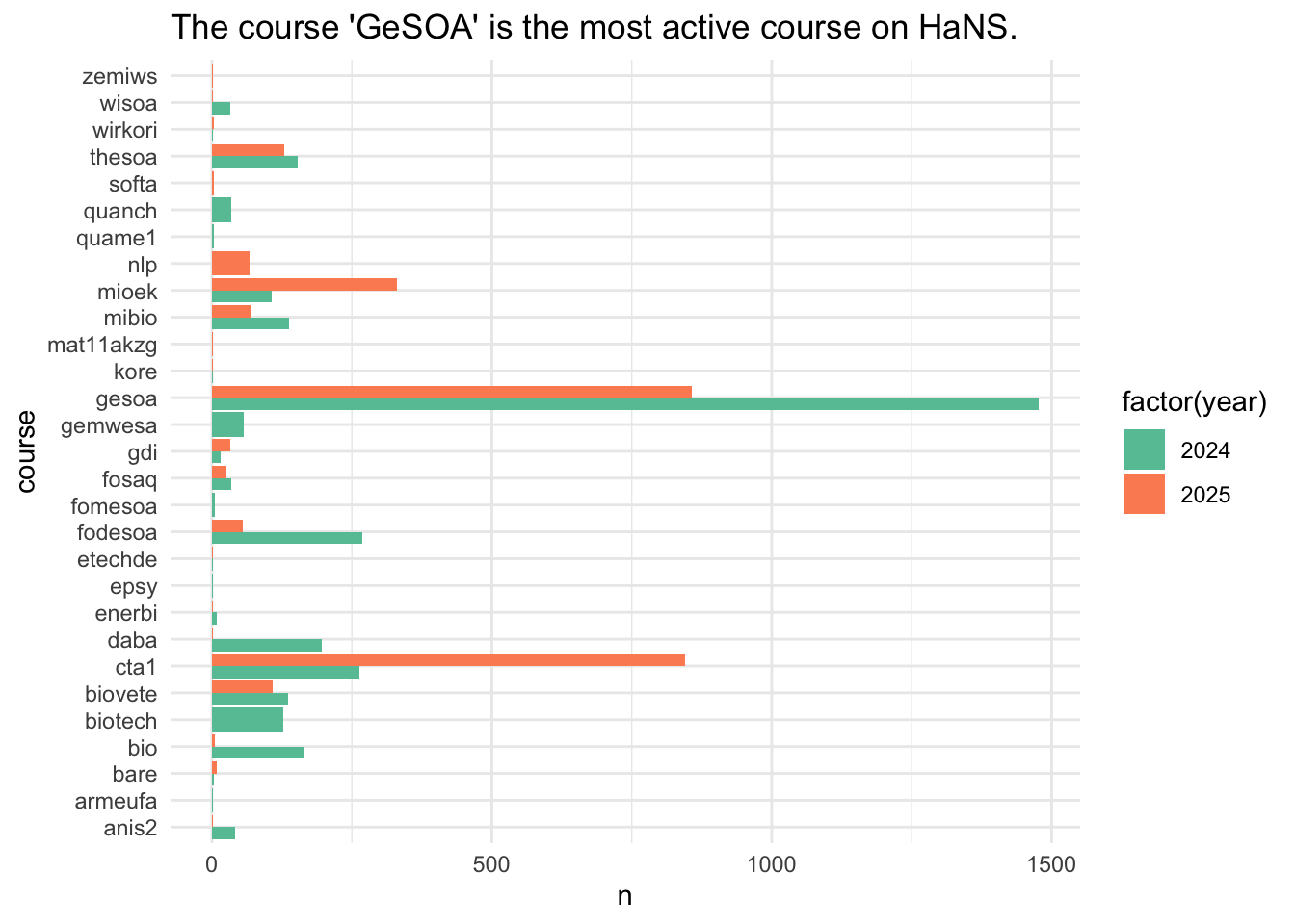 time_spent_w_course_university|>distinct(fingerprint, .keep_all =TRUE)|>count(year, course)|>drop_na()|>ggplot(aes(x =n, y =course, fill =factor(year), ))+geom_col(position ="dodge")+labs(title ="The course 'GeSOA' is the most active course on HaNS.")