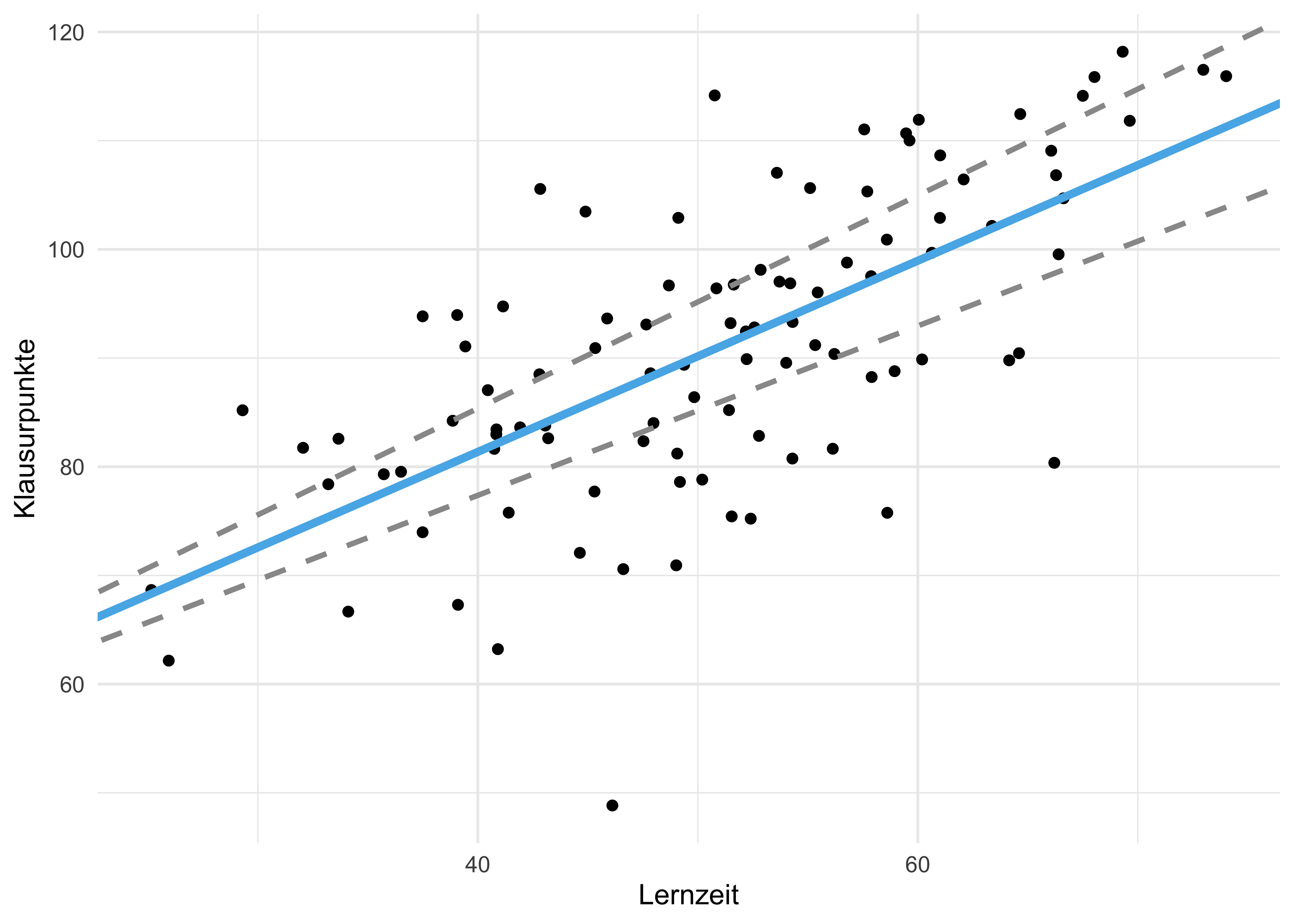 - Wie stark ist der (lineare) Zusammenhang \(b\) von Lernzeit und Note (im Fach Statistik) in der Grundgesamtheit?