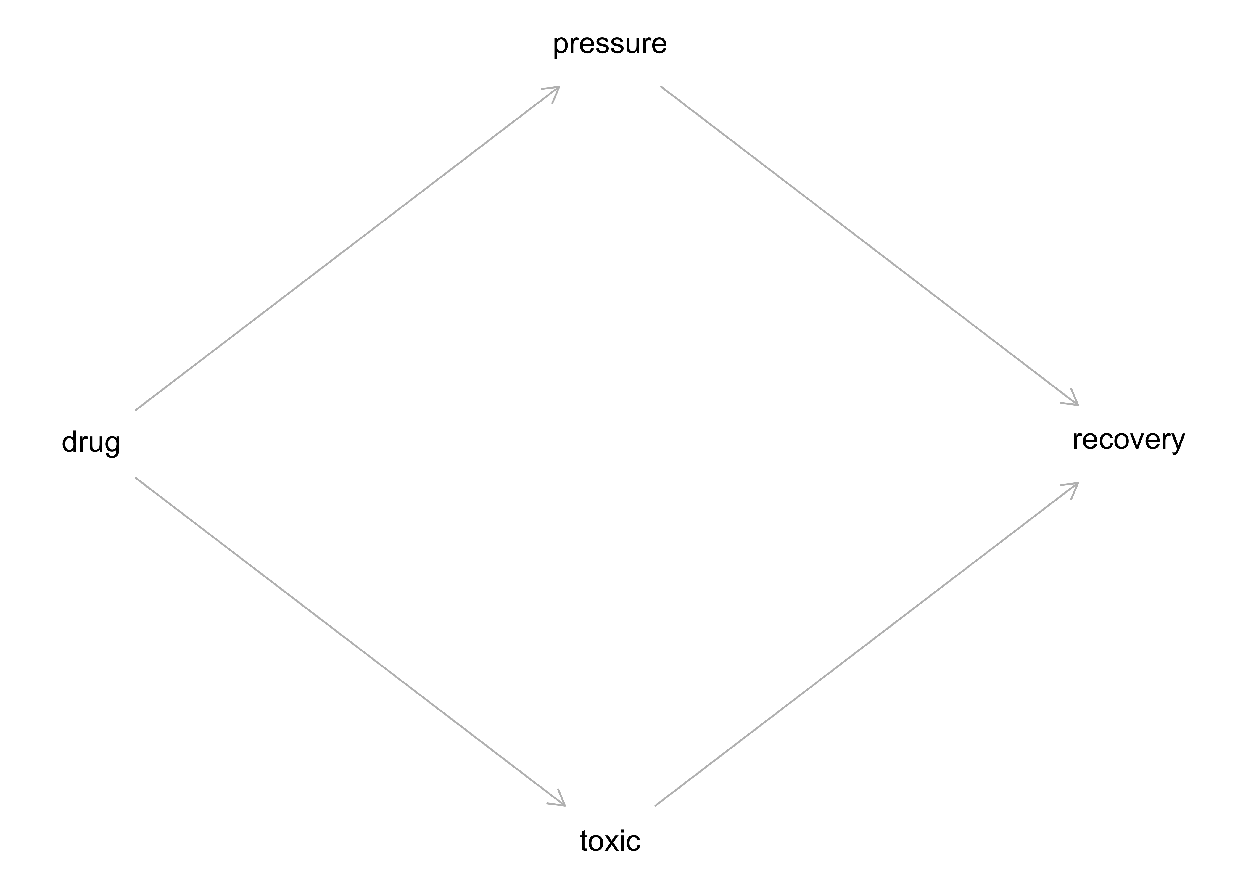 Das Medikament hat einen (absenkenden) Einfluss auf den Blutdruck. Gleichzeitig hat das Medikament einen (toxischen) Effekt auf die Heilung. Verringerter Blutdruck hat einen positiven Einfluss auf die Heilung. Sucht man innerhalb der Leute mit gesenktem Blutdruck nach Effekten, findet man nur den toxischen Effekt: Gegeben diesen Blutdruck ist das Medikament schädlich aufgrund des toxischen Effekts. Der positive Effekt der Blutdruck-Senkung ist auf diese Art nicht zu sehen.