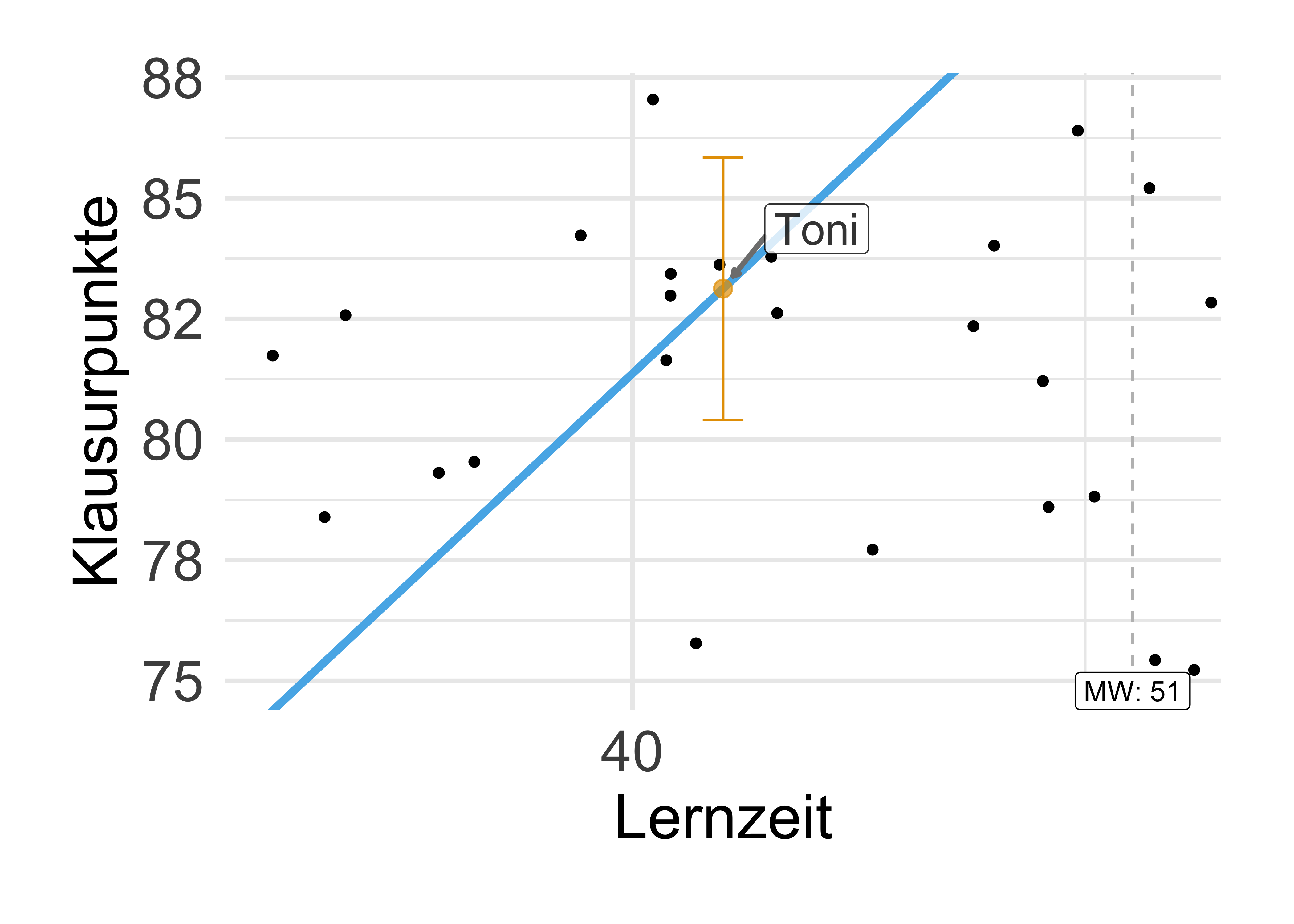 Beispiel 2.3 (Toni lernt für die Klausur) Oh nein, die Klausur im Fach Statistik steht an. Toni lernt ziemlich viel. Wie viel Punkte (von 100 möglichen) wird er wohl erzielen? Ziehen wir ein einfaches statistisches Modell zur Rate, um eine Vorhersage für den “Klausurerfolg” von Toni zu erhalten. Wir können vom Modell eine einzelne Zahl (83) als Punkt-Schätzwert bzw. Vorhersagewert erhalten oder einen Schätzbereich (80-80 Punkte). \(\square\)