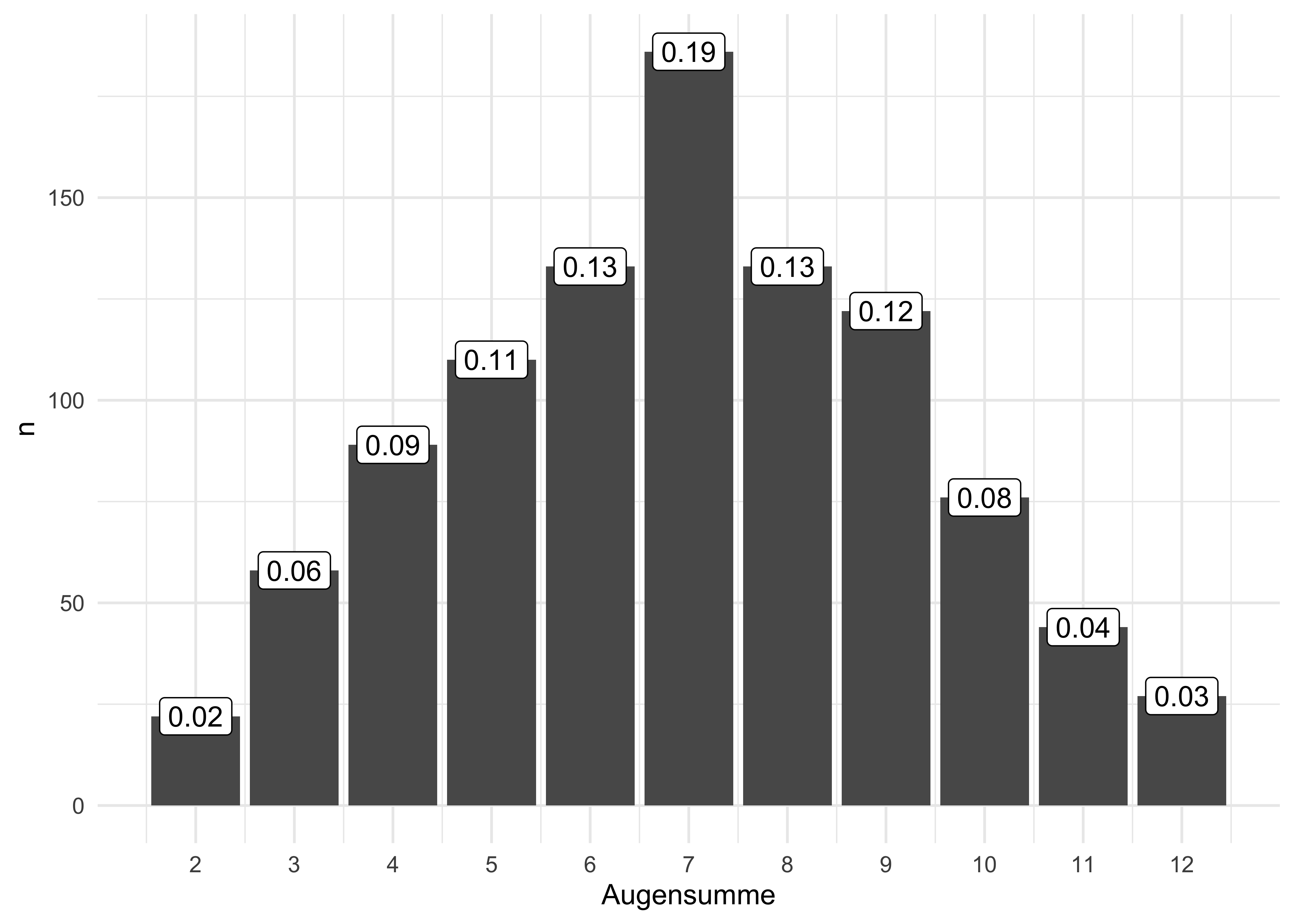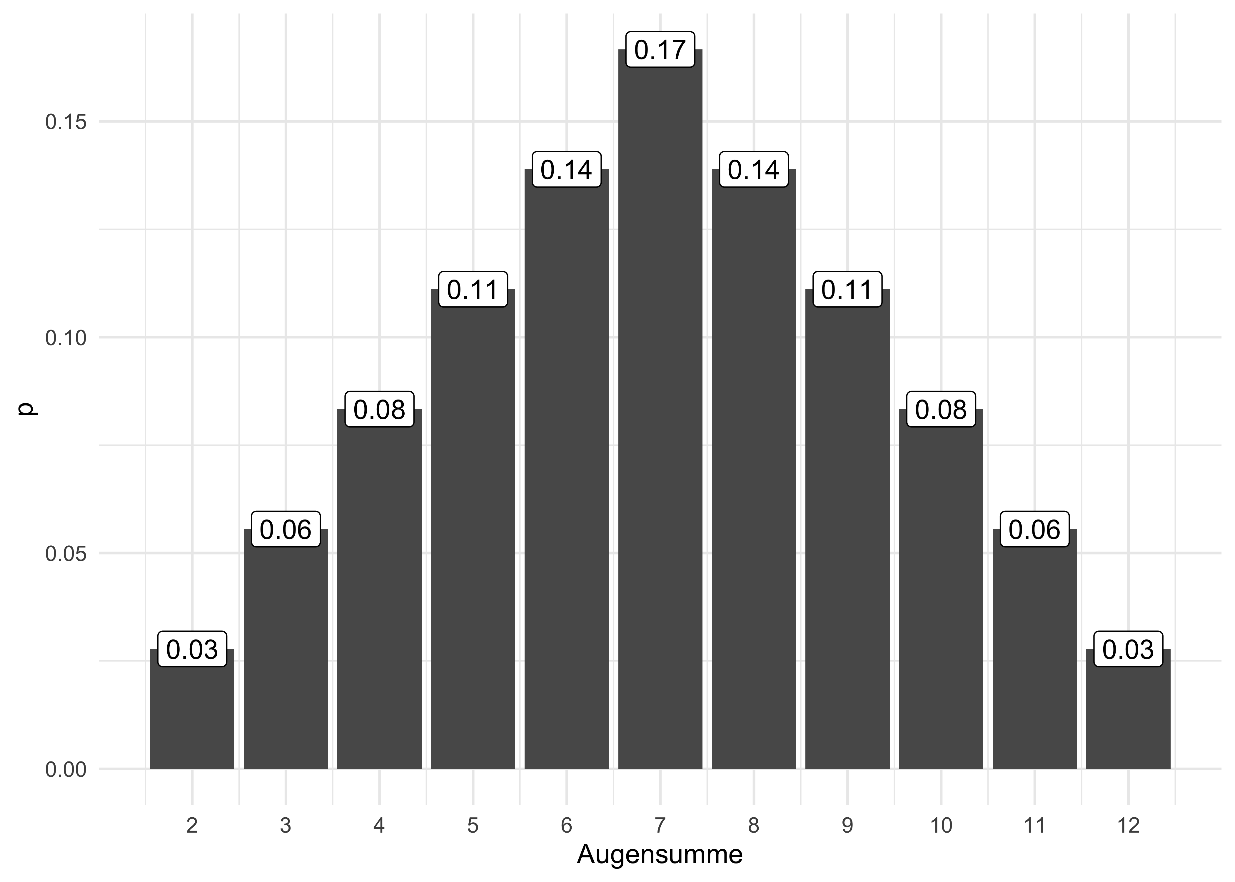 Beispiel 3.26 Der zweifache Würfelwurf ist ein typisches Lehrbuchbeispiel für eine diskrete Zufallsvariable. 17 Hier ist \(S\)18 die Augensumme des zweifachen Würfelwurfs und \(S\) ist eine Zahl zwischen 2 und 12. Für jede Realisation \(X=x\) kann man die Wahrscheinlichkeit berechnen, Abbildung 3.23 versinnbildlicht die Wahrscheinlichkeit für jede Realisation von \(X\).\(\square\)