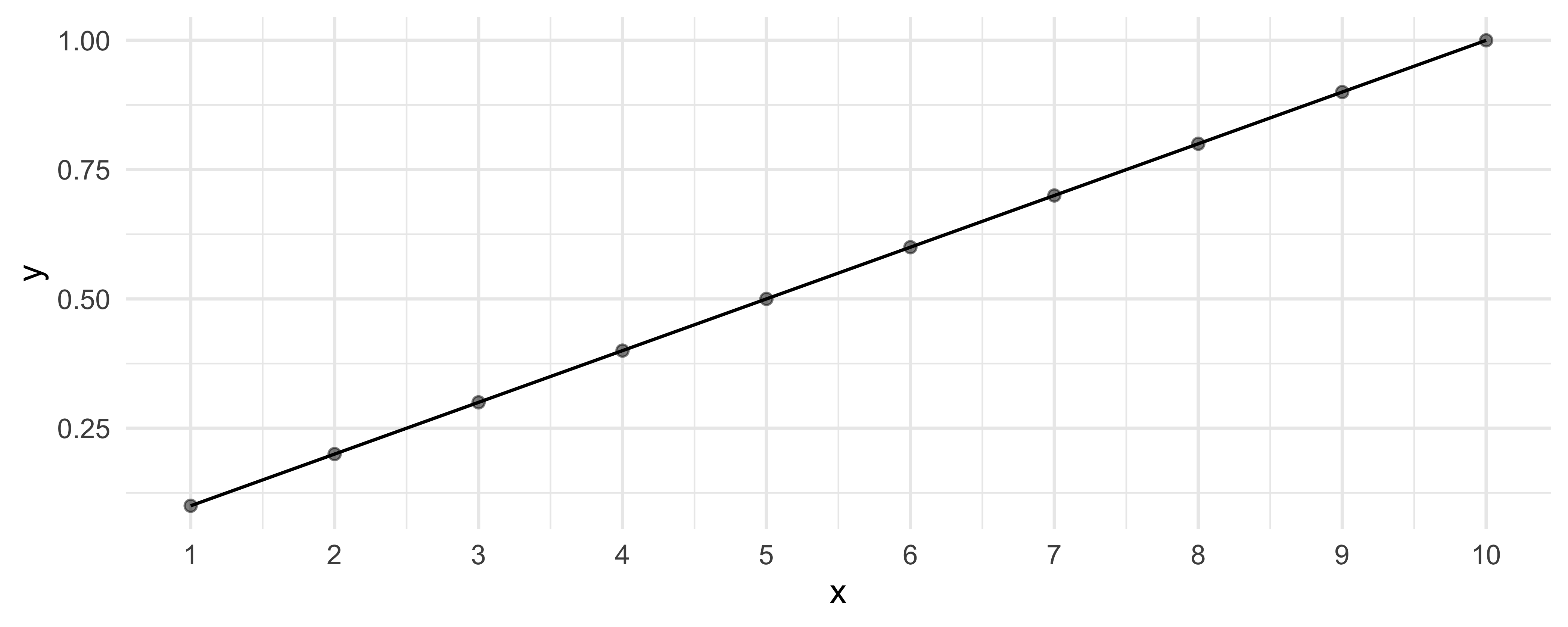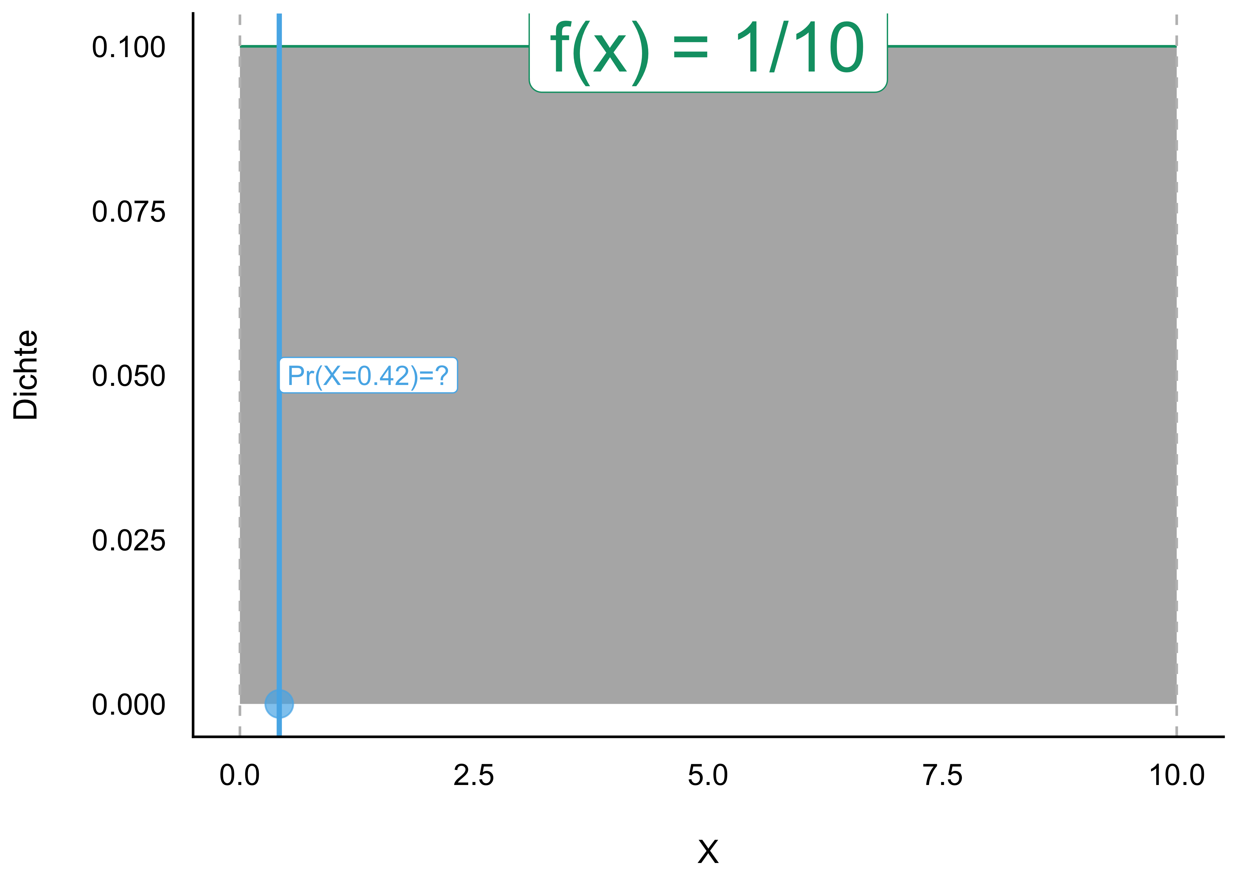 Was gleich ist in beiden Situationen (\(Pr(X=.42)\) und \(Pr(0<x<0.5)\)) ist die Wahrscheinlichkeitsdichte, \(f\). In Abbildung 3.31 und Abbildung 3.30 ist die Wahrscheinlichkeitsdichte gleich, \(f=1/10=0.1\).