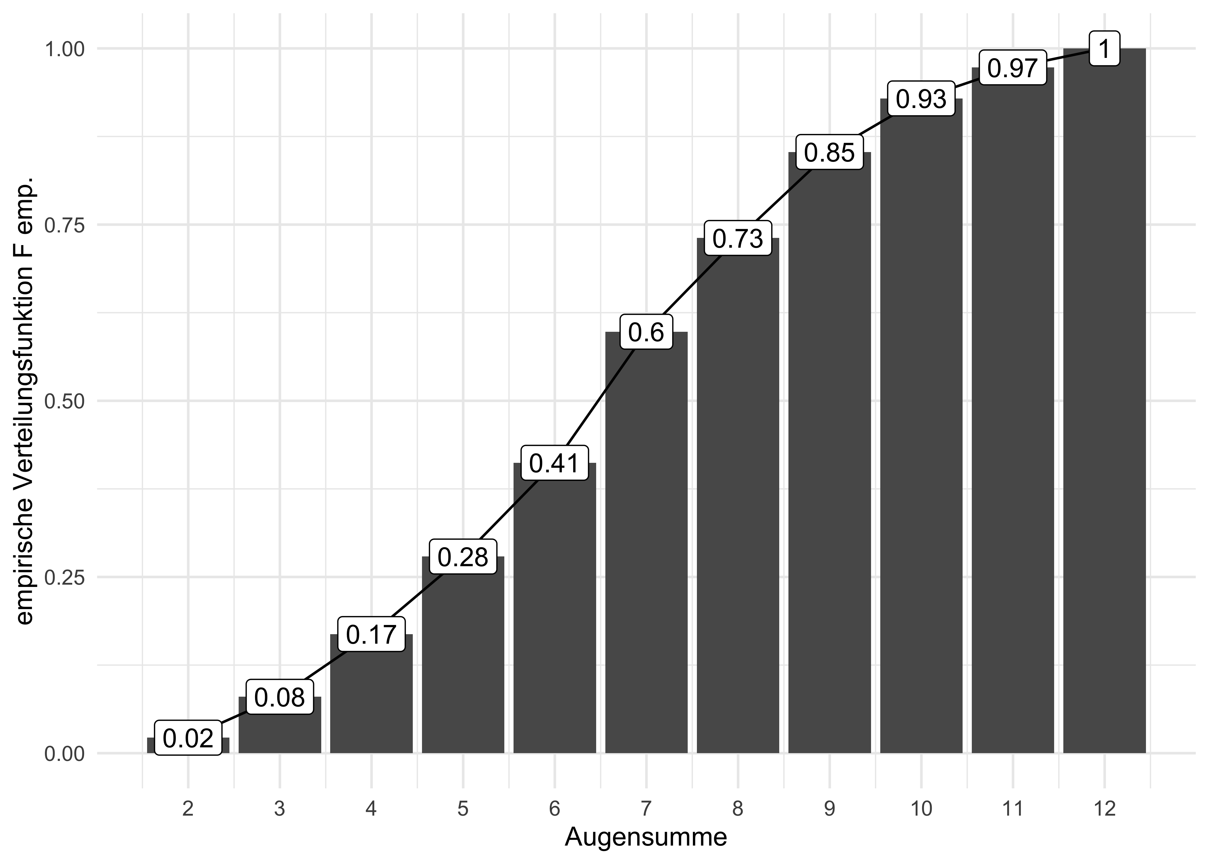 Die Verteilungsfunktion ist das Pendant zur kumulierten Häufigkeitsverteilung, vgl. Abbildung 3.27 und Abbildung 3.28: Was die kumulierte Häufigkeitsverteilung für Häufigkeiten ist, ist die Verteilungsfunktion für Wahrscheinlichkeiten.