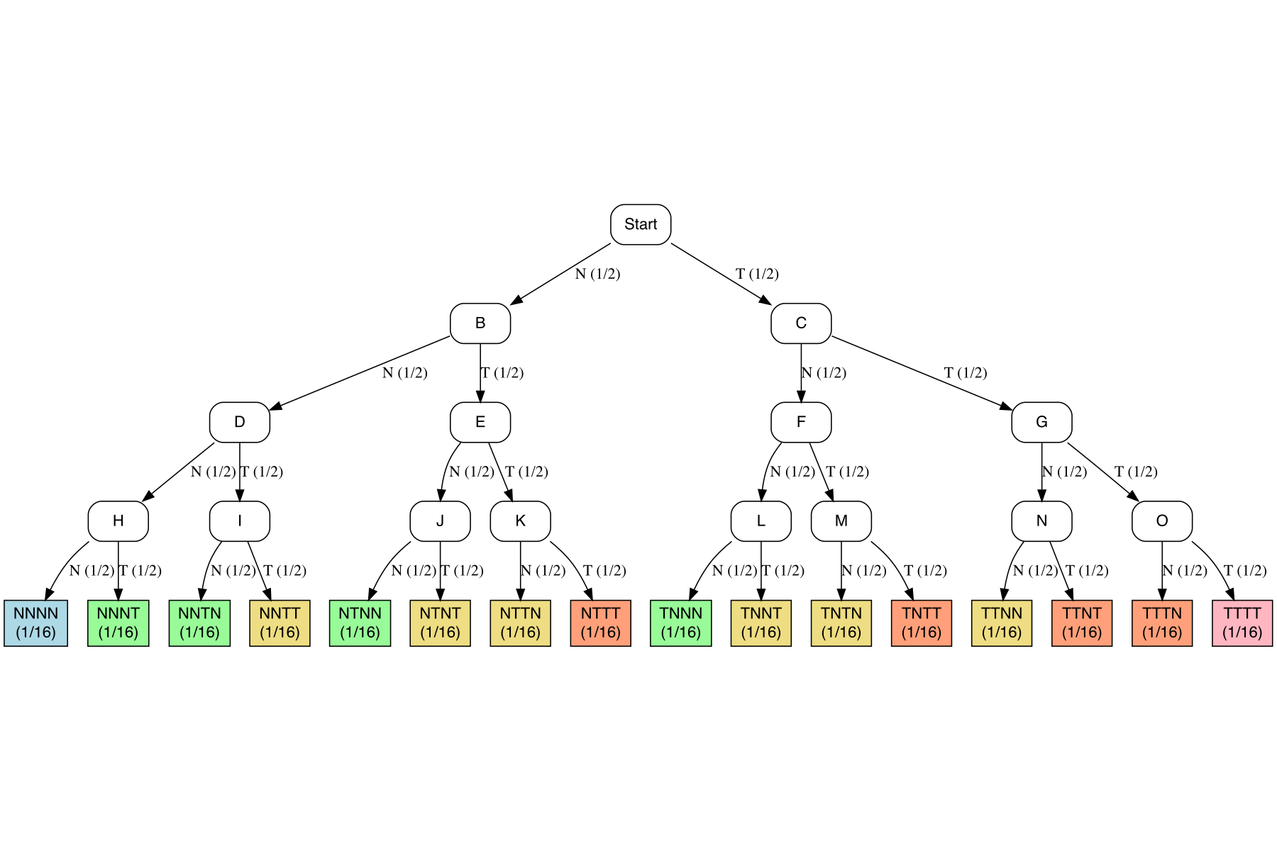 Abbildung 3.2 zeigt die möglichen Ausgänge (T wie Treffer (Party) und N (Niete, Lernen)) dieses Zufallexperiments.