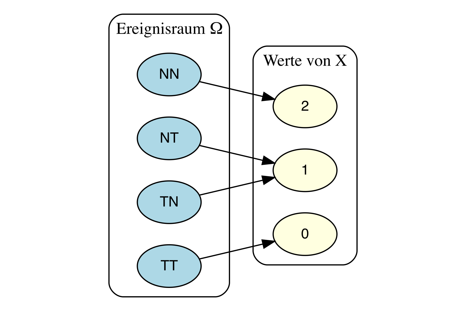 Definition 3.17 (Zufallsvariable) Die Zuordnung der Elementarereignisse eines Zufallsexperiments zu genau einer Zahl \(\in \mathbb{R}\) nennt man Zufallsvariable.\(\square\)