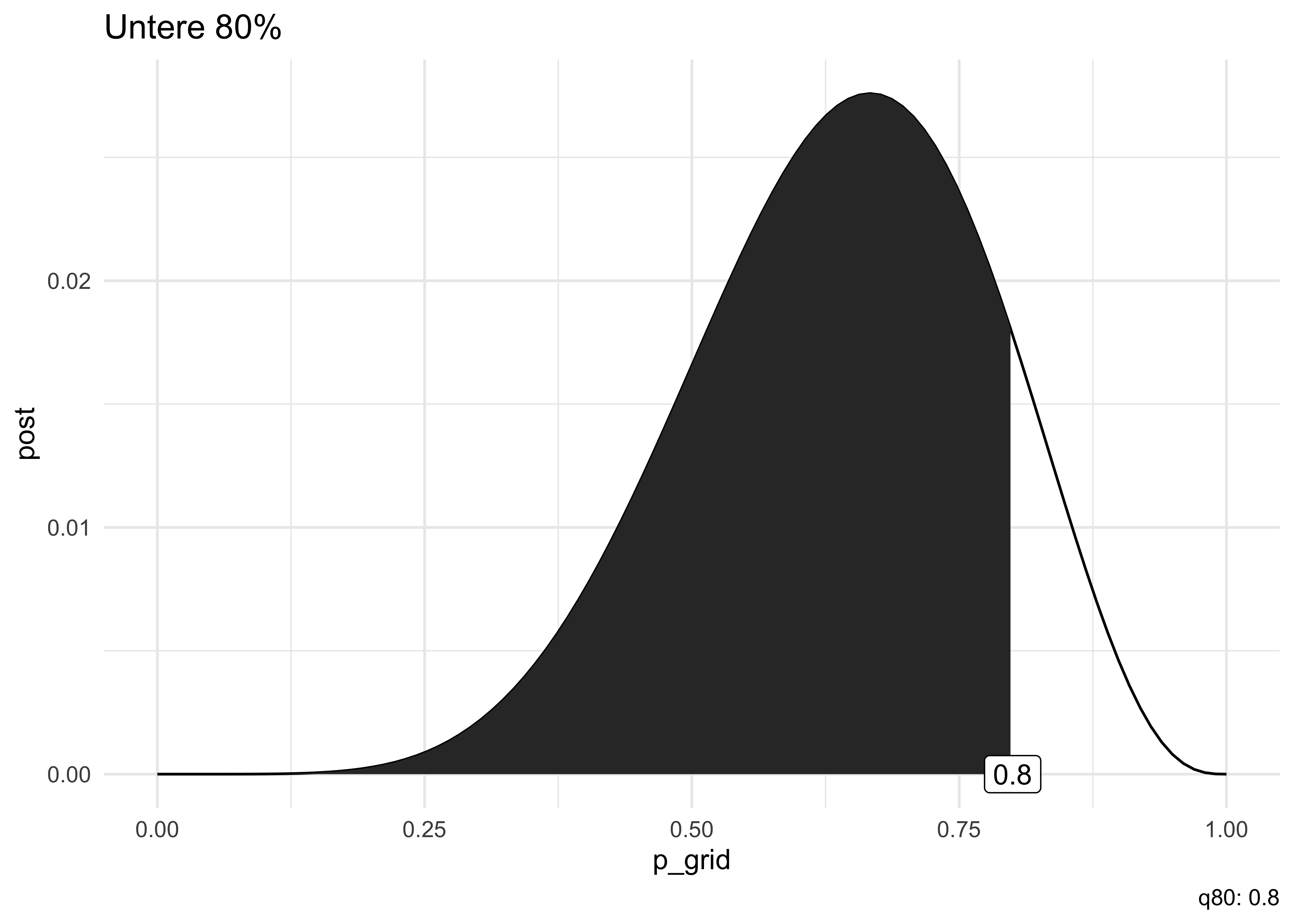Aus Abbildung 7.1 können wir einfach auslesen, wie wahrscheinlich gewisse Parameterwerte sind. So sehen wir, dass das Modell Parameterwerte (Wasseranteil, \(\pi\)) zwischen ca. 50% und 70% für am wahrscheinlichsten hält. Aber auch kleine Anteile wie 25% sind nicht auszuschließen (auf Basis der Daten und der Modellannahmen).