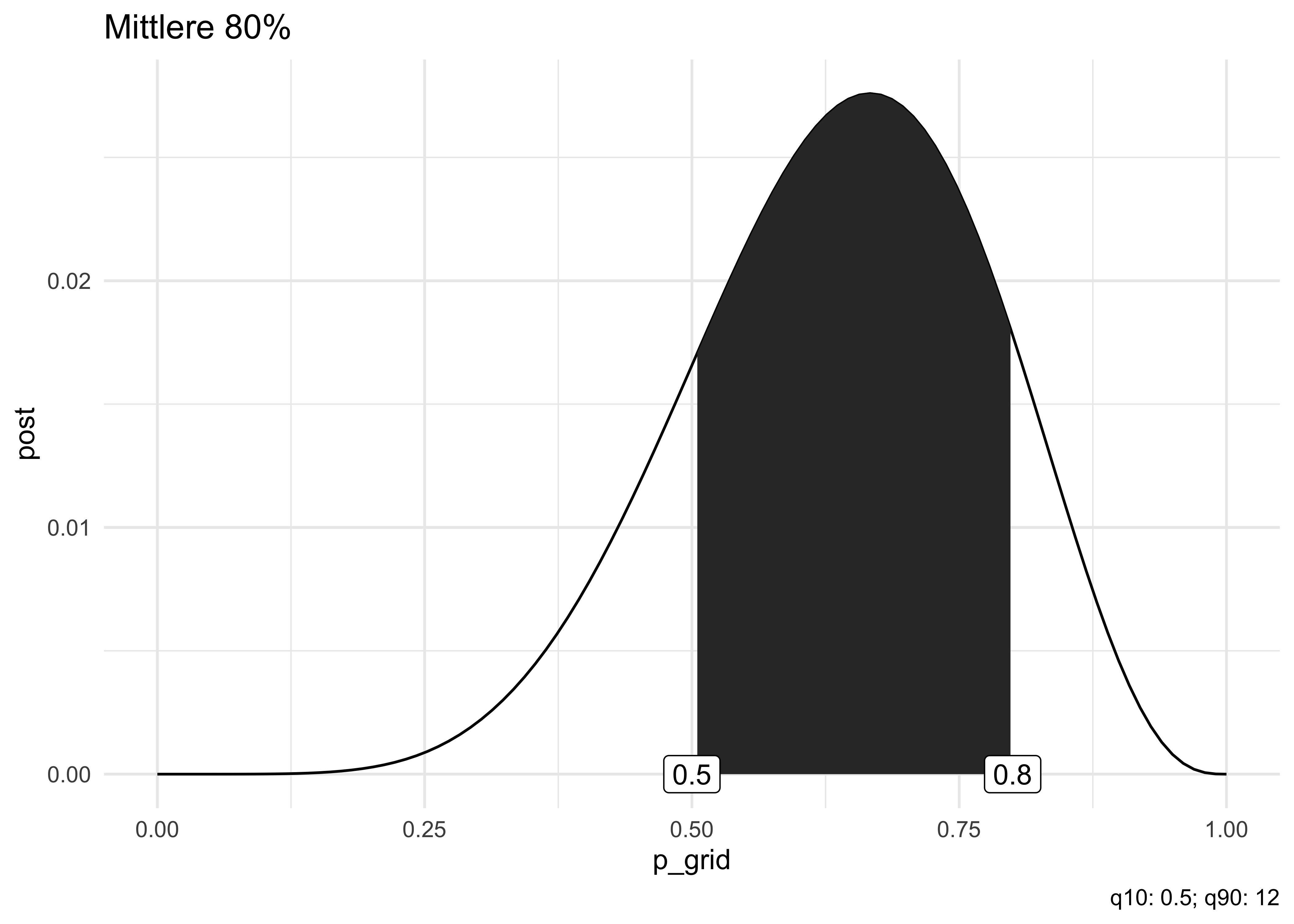 Mit dieser “schiefen” Post-Verteilung können wir gut die Auswirkungen auf das Perzentil- und das Höchste-Dichte-Intervall anschauen.