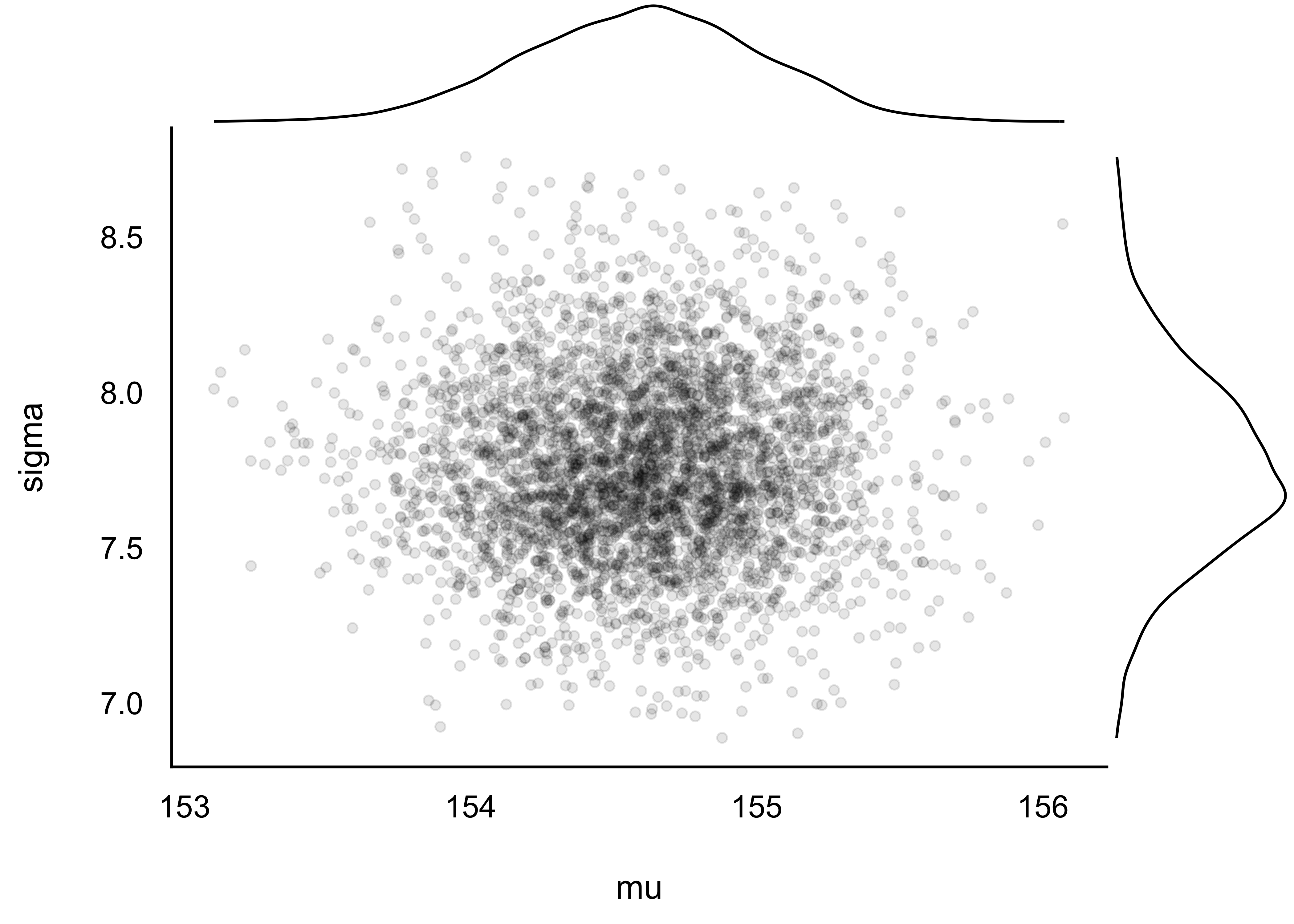 \[ \begin{aligned} h_i &\sim \mathcal{N}(\mu, \sigma) & \text{Likelihood} \\ \mu &\sim \mathcal{N}(178, 20) & \text{Prior} \\ \sigma &\sim \mathcal{E}(1/8) & \text{Prior} \end{aligned} \tag{8.2}\]
