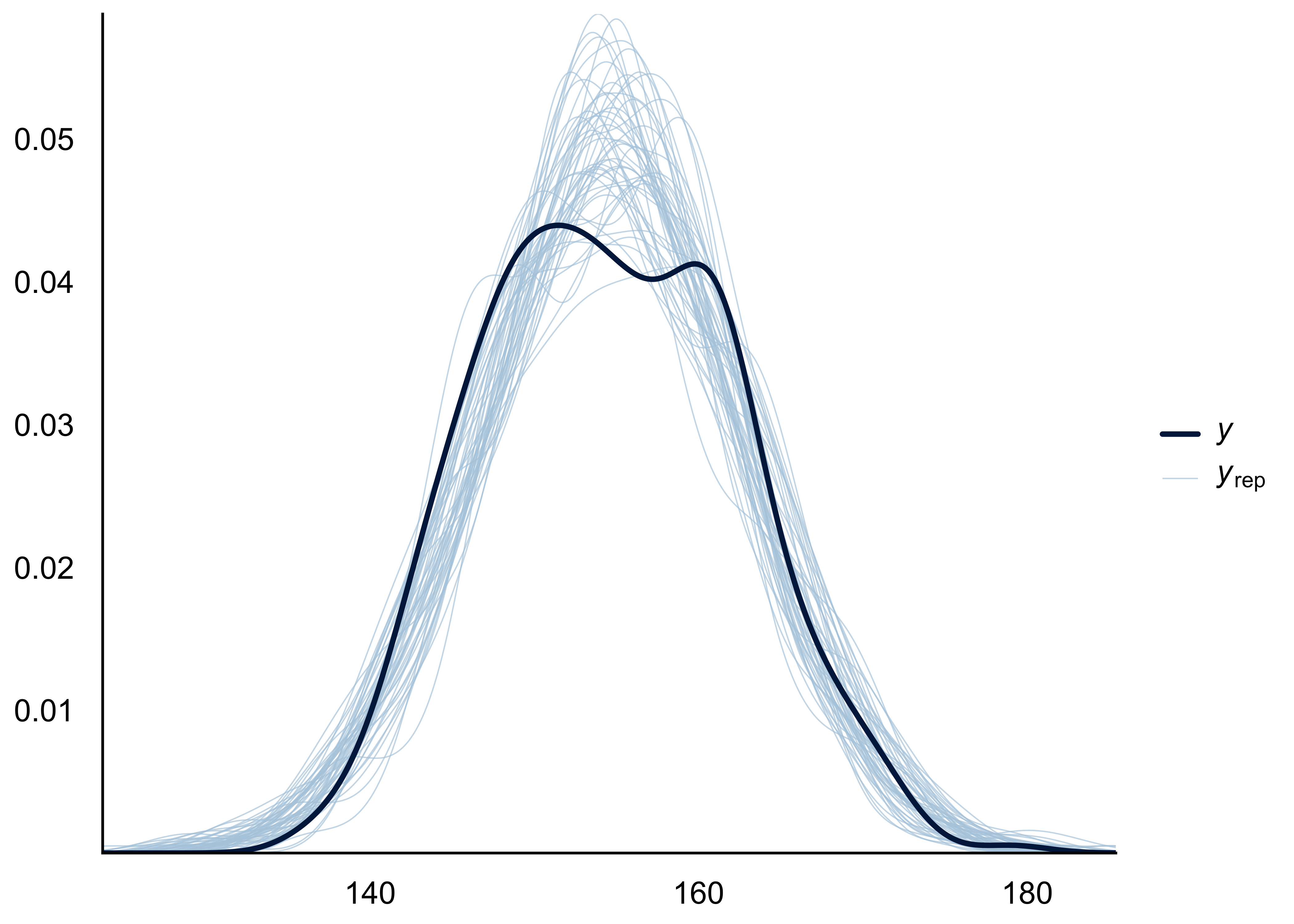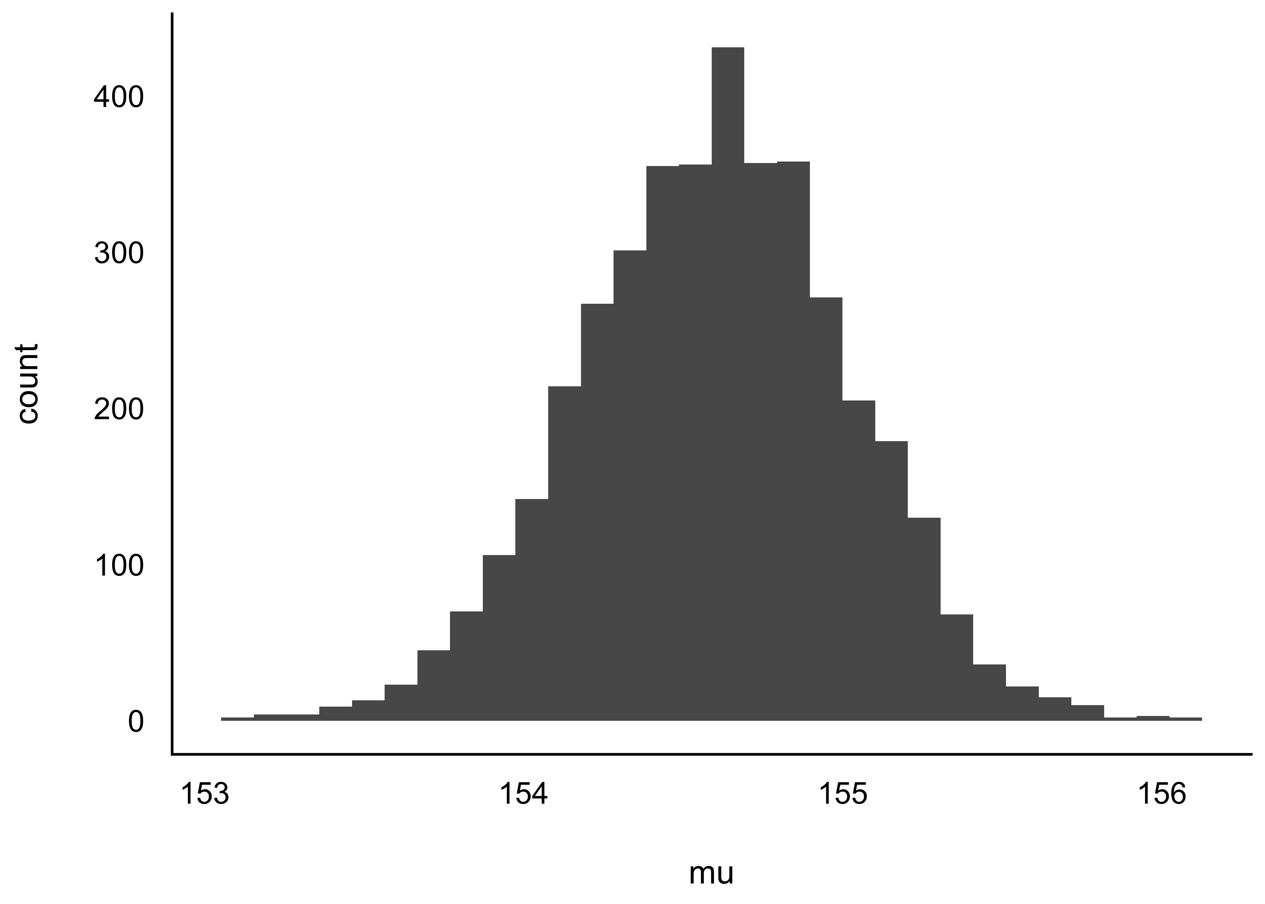 Bisher haben wir untersucht, wie die Verteilung der mittleren Körpergrößen, \(\mu\), laut unserem Modell aussehen könnte; wir haben uns also mit der Post-Verteilung von \(\mu\) beschäftigt. Wir könnten aber auch an der Frage der Verteilung der tatsächlichen Körpergrößen, \(h_i\), laut Modell, interessiert sein: Wie groß sind sie denn, die !Kung, laut unserem Modell?