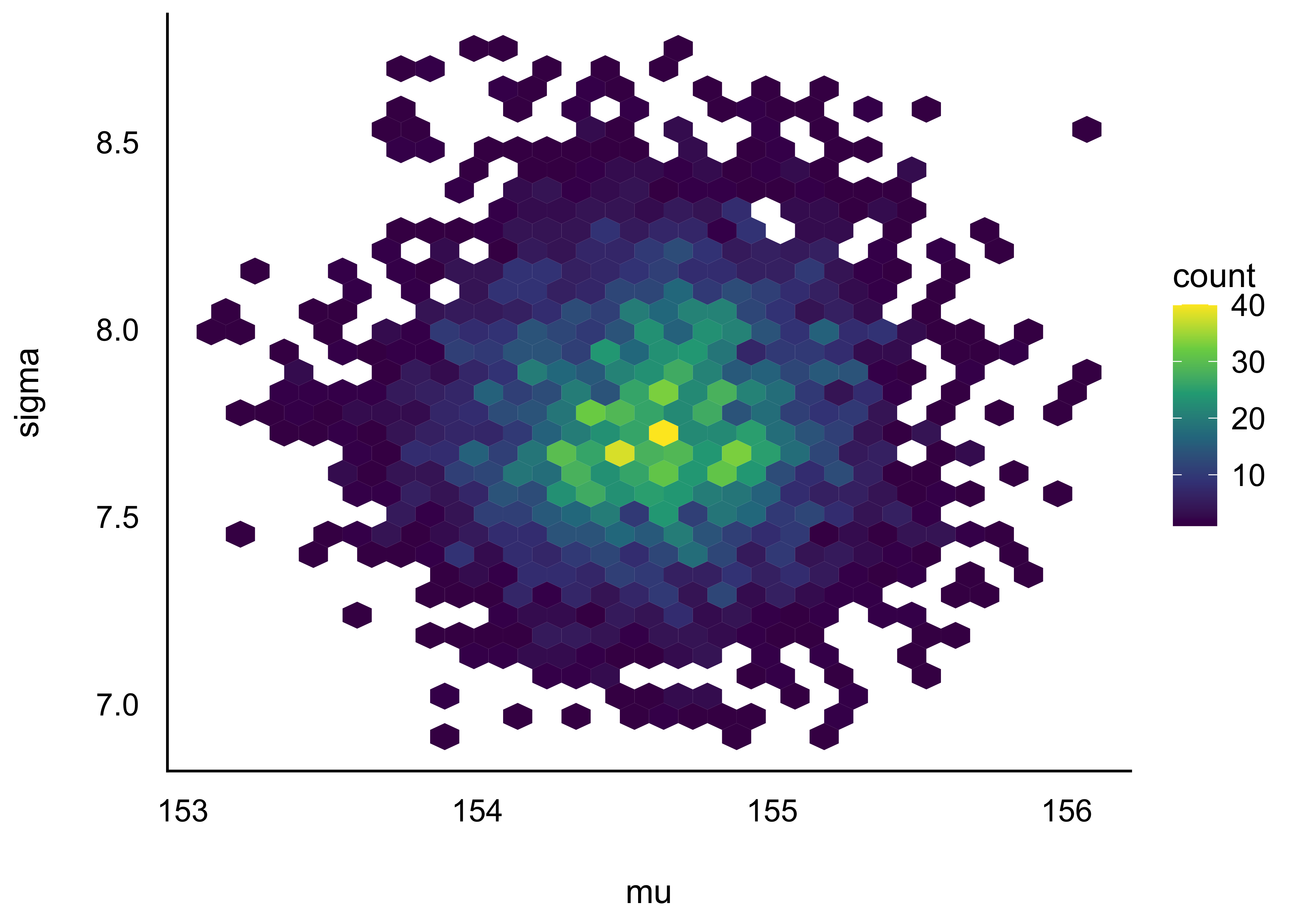 Laut unserem Modell sind die Körpergrößen, \(h_i\), normalverteilt mit \(\mu\) und \(\sigma\). \(\mu\) wird von Stan, der in Begriffen der Regressionsanalyse denkt, schnöde als (Intercept)