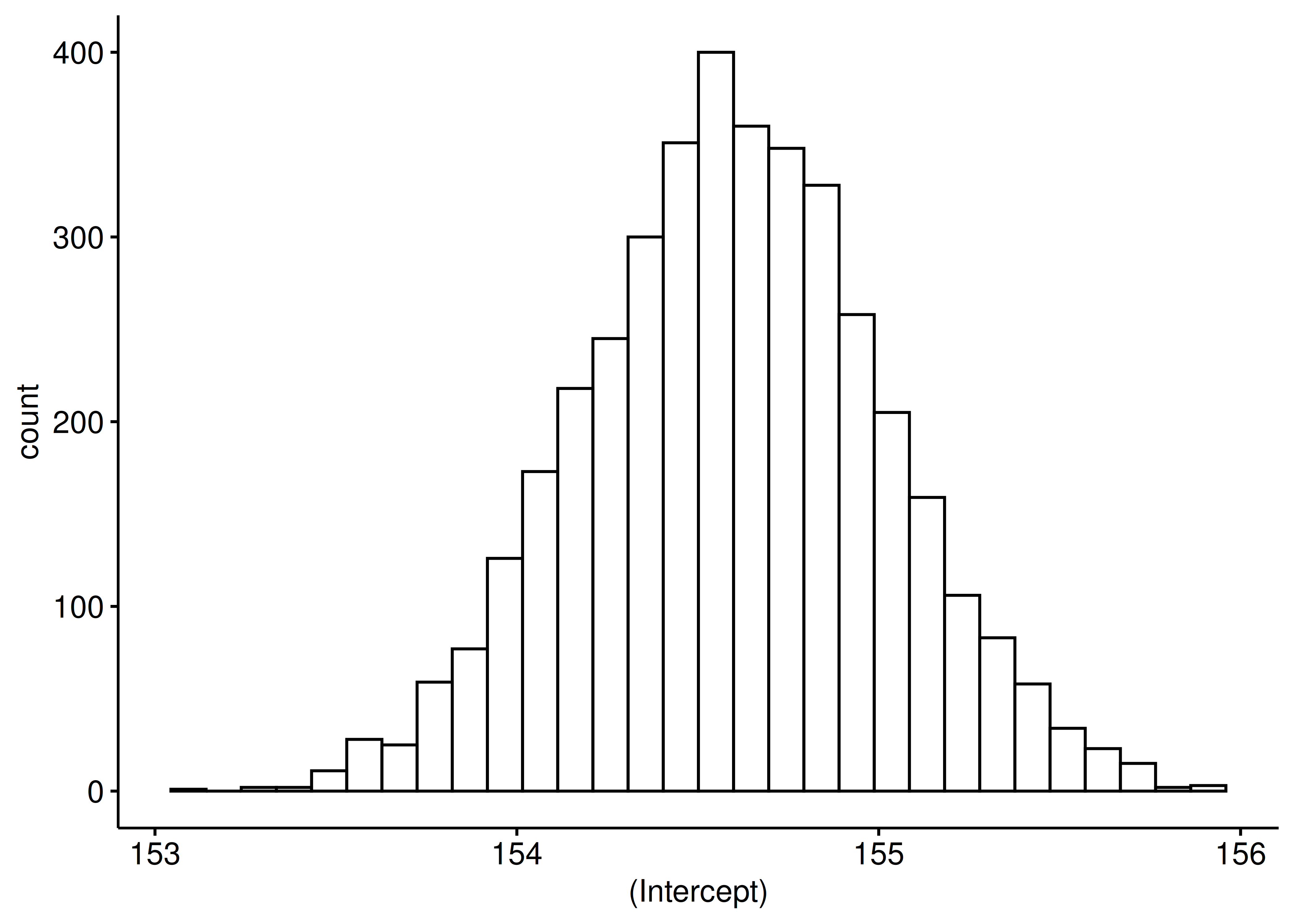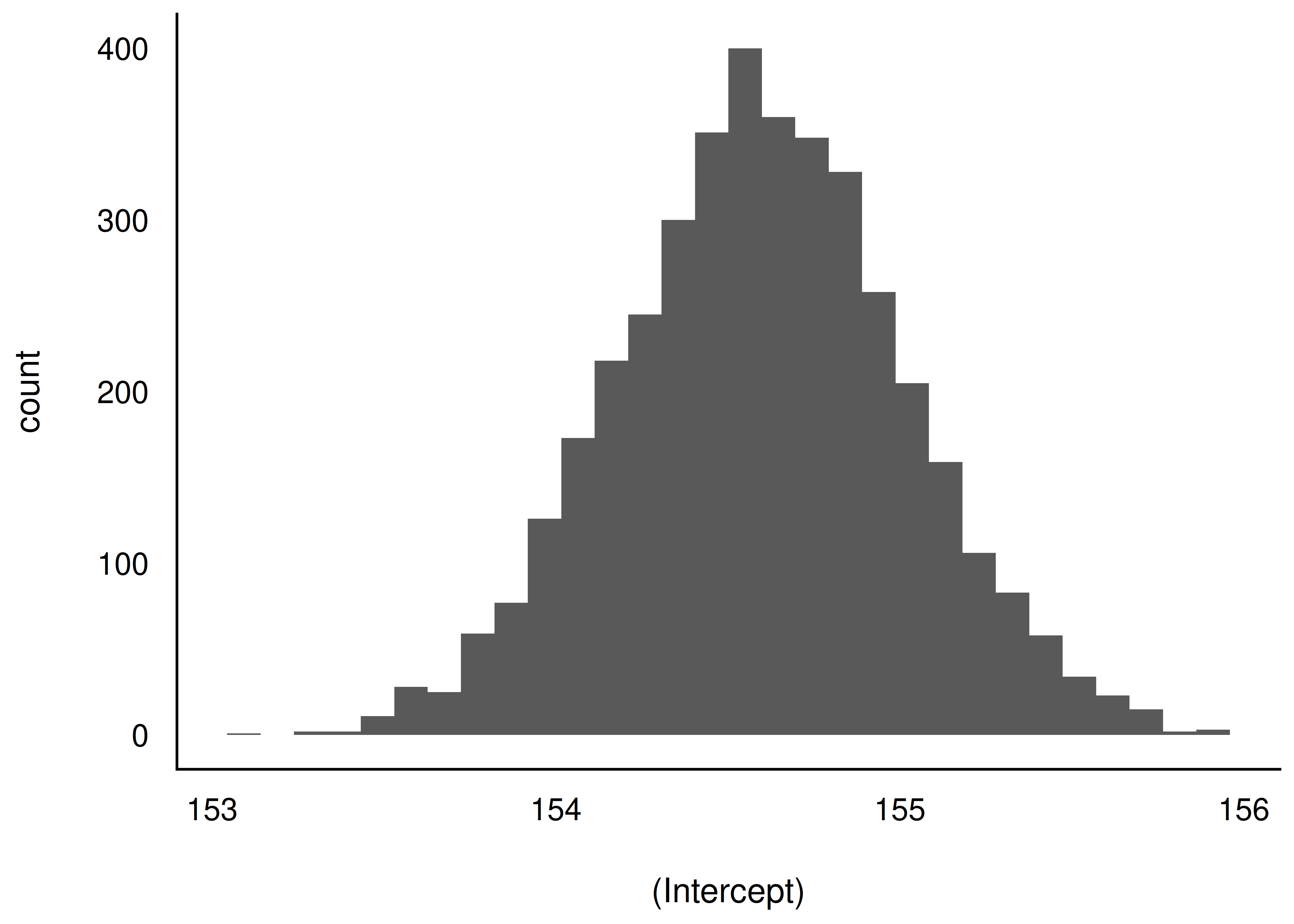 m_kung |> as_tibble() |> head()Laut unserem Modell sind die Körpergrößen, \(h_i\), normalverteilt mit \(\mu\) und \(\sigma\). \(\mu\) wird von Stan, der in Begriffen der Regressionsanalyse denkt, schnöde als (Intercept) bezeichnet. Wir könnten jetzt also für jede Zeile eine Normalverteilung berechnen. Und daraus zufällig eine Zahl ziehen. Damit hätten wir dann unsere Verteilung von Körpergrößen laut Modell. Diese Verteilung nennt man auch Posterior-Prädiktiv-Verteilung. Prädiktiv daher, weil sie die Werte der Körpergrößen “vorhersagt”.