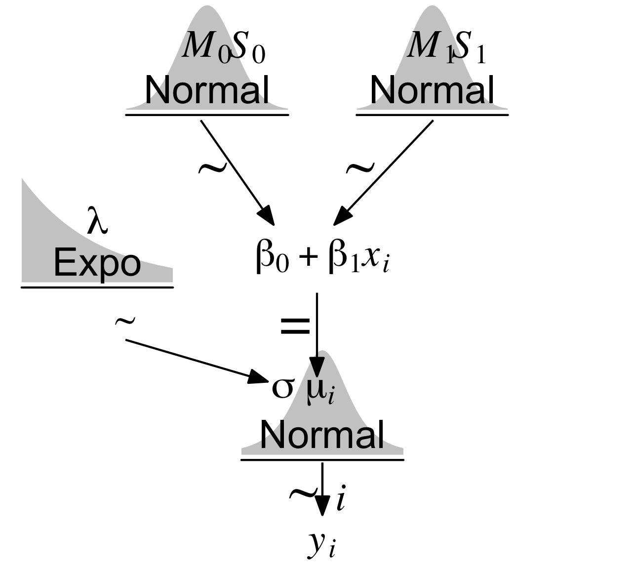 ist, gegeben \(\mu\) und \(\sigma\). Theorem 9.1 stellt die Modelldefinition dar. ?fig-kruschke_regr_one_predctor zeigt, wie die drei Parameter zusammen die Likelihood definieren.
