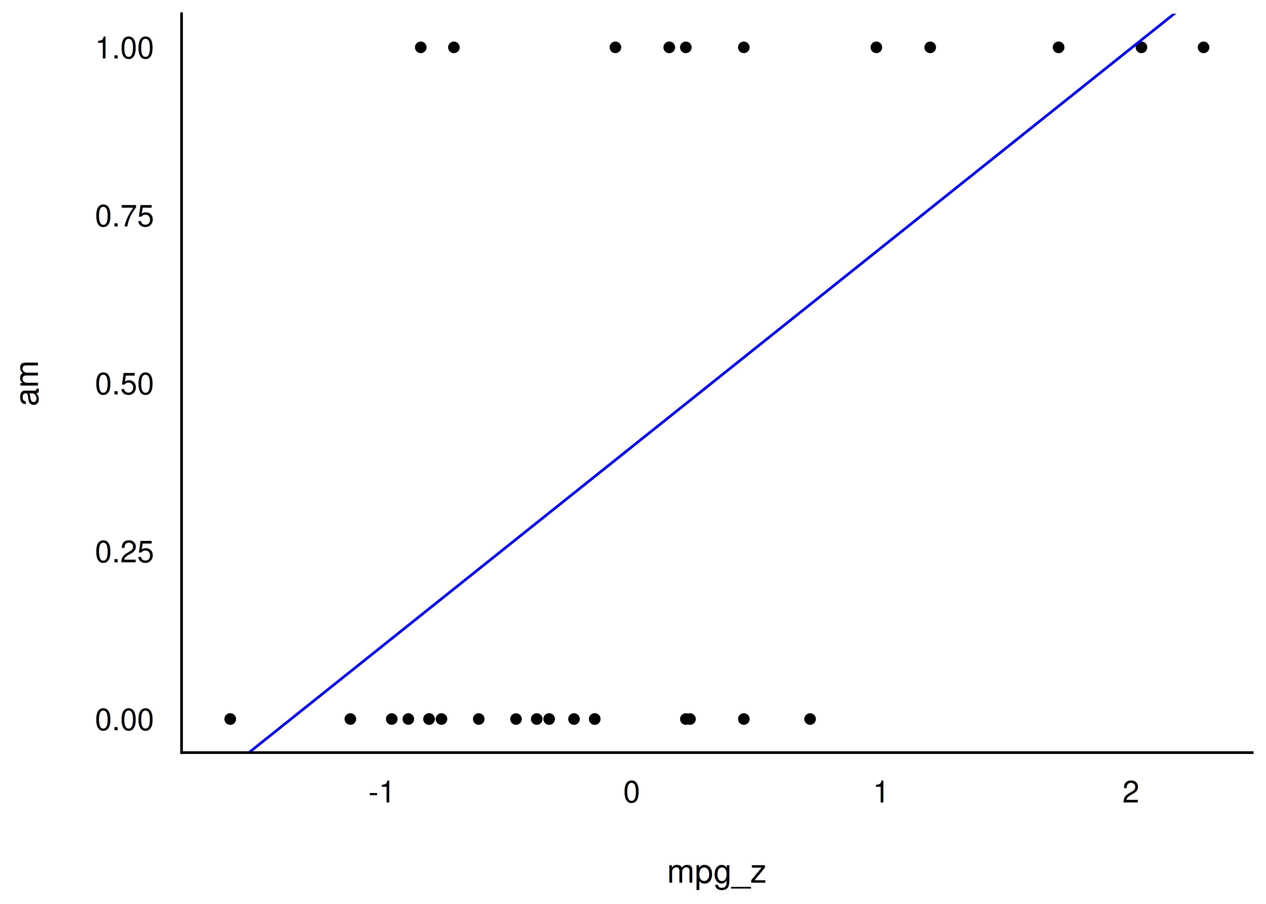 color = "blue") Für kleine Werte von mpg_z (<1.3) sagt unser Modell negative Werte für am voraus. Das macht keinen Sinn: Es gibt keine negative Werte von am, nur 0 und 1. Müssen wir mal bei Gelegenheit besser machen.