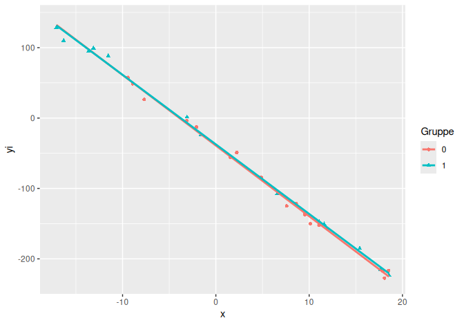 Dazu kommt noch eine Gruppierungsvariable \(g\) (mit den Stufen 0 und 1). Das Modell lautet also: y ~ x + g.