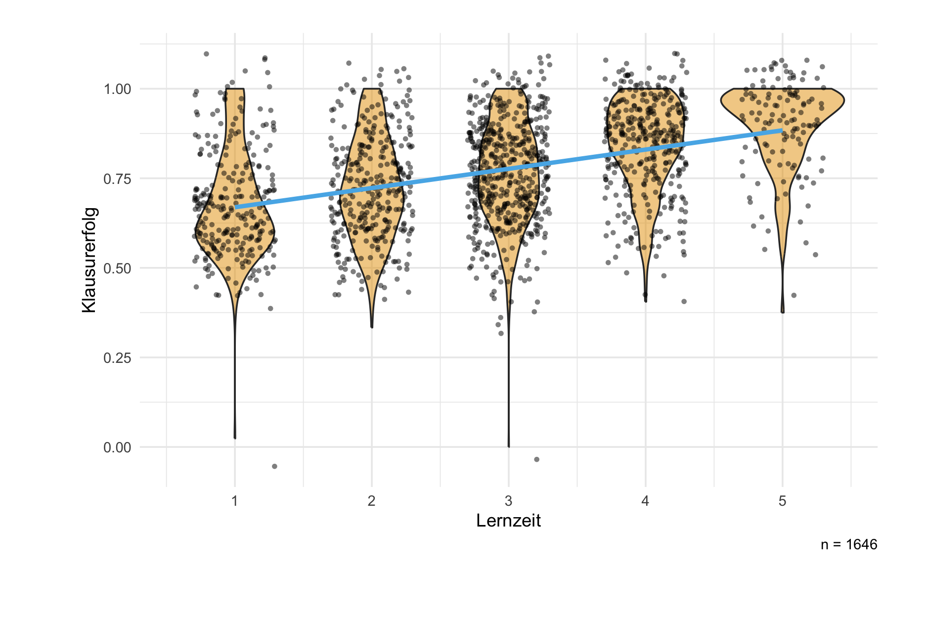 Das Lesen einer Schwimmfibel nutzt wenig, wenn Sie Freischwimmer werden wollen. Es hilft nichts: Rein in die Fluten! Wenn das Wasser nicht tief ist und man jederzeit im Trockenen Pause machen kann, steht Ihrem Fortschritt beim Lernen nichts im Weg. Ich gebe zu, der Vergleich ist nicht gerade subtil. Aber es ist so: Sie lernen durch Tun (Lovett & Greenhouse, 2000). Dieses Buch bietet dafür reichhaltige Gelegenheit. Nutzen Sie sie. Jedes Kapitel führt am Ende eine Reihe von Aufgaben auf, alle mit Lösungen. So können Sie Ihren Lernfortschritt testen. Dass Schwierigkeiten auftreten, wenn man etwas Neues lernt, ist normal. Das geht fast allen so. Ihren Lernerfolg kann nur eine Sache gefährden: Wenn Sie aufgeben. Bleiben Sie dran, und der Erfolg wird sich einstellen! Abbildung 1.2 zeigt Daten von \(n=1646\) Studierenden, die zeigen, dass regelmäßiges Üben und Dranbleiben mit Erfolg einhergeht (Sauer, 2017). Dran bleiben ist der Schlüssel zum Erfolg. Üben Sie regelmäßig. Geben Sie bei Schwierigkeiten nicht auf.