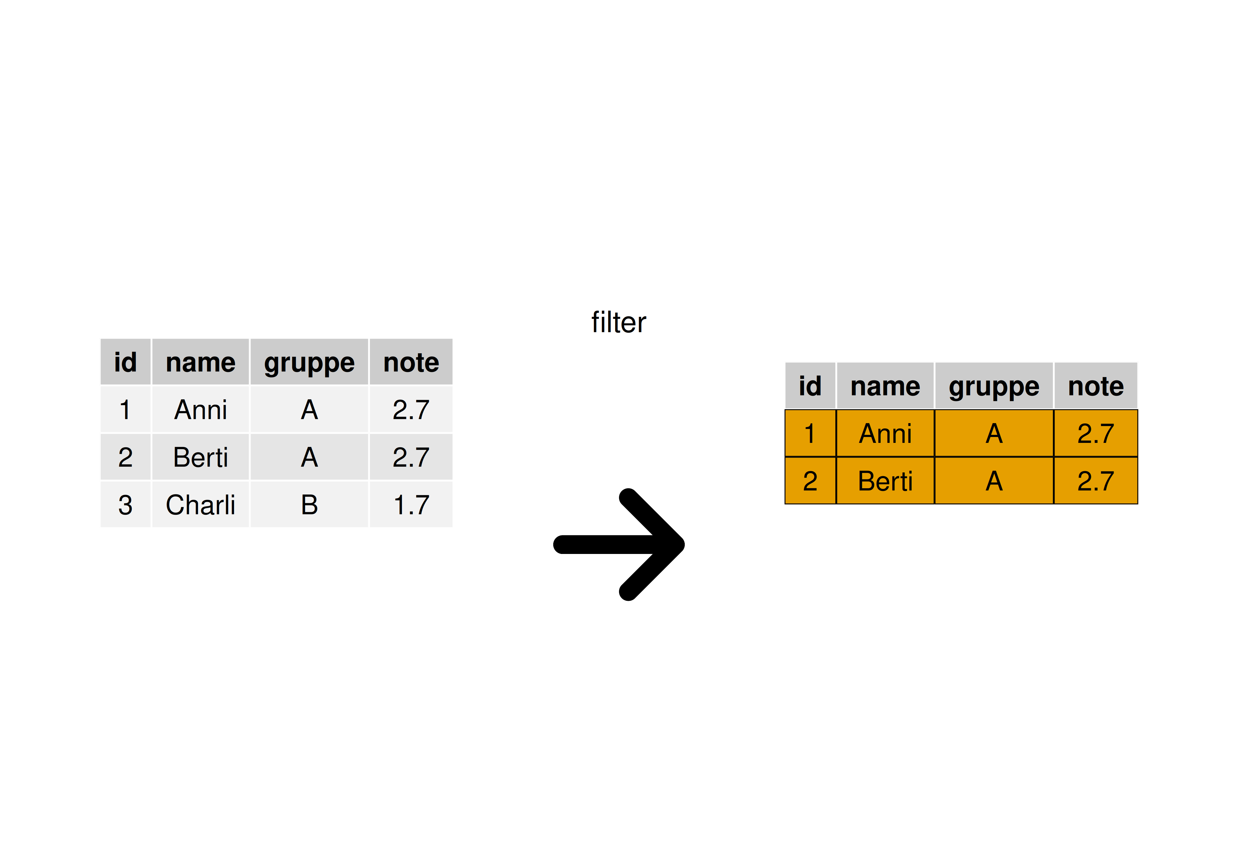 Zeilen filtern bedeutet, dass man nur bestimmte Zeilen (Beobachtungen) behalten möchte, die restlichen Zeilen brauchen wir nicht, weg mit ihnen. Wir haben also ein Filterkriterium im Kopf, anhand dessen wir die Tabelle filern, s. Abbildung 4.4.