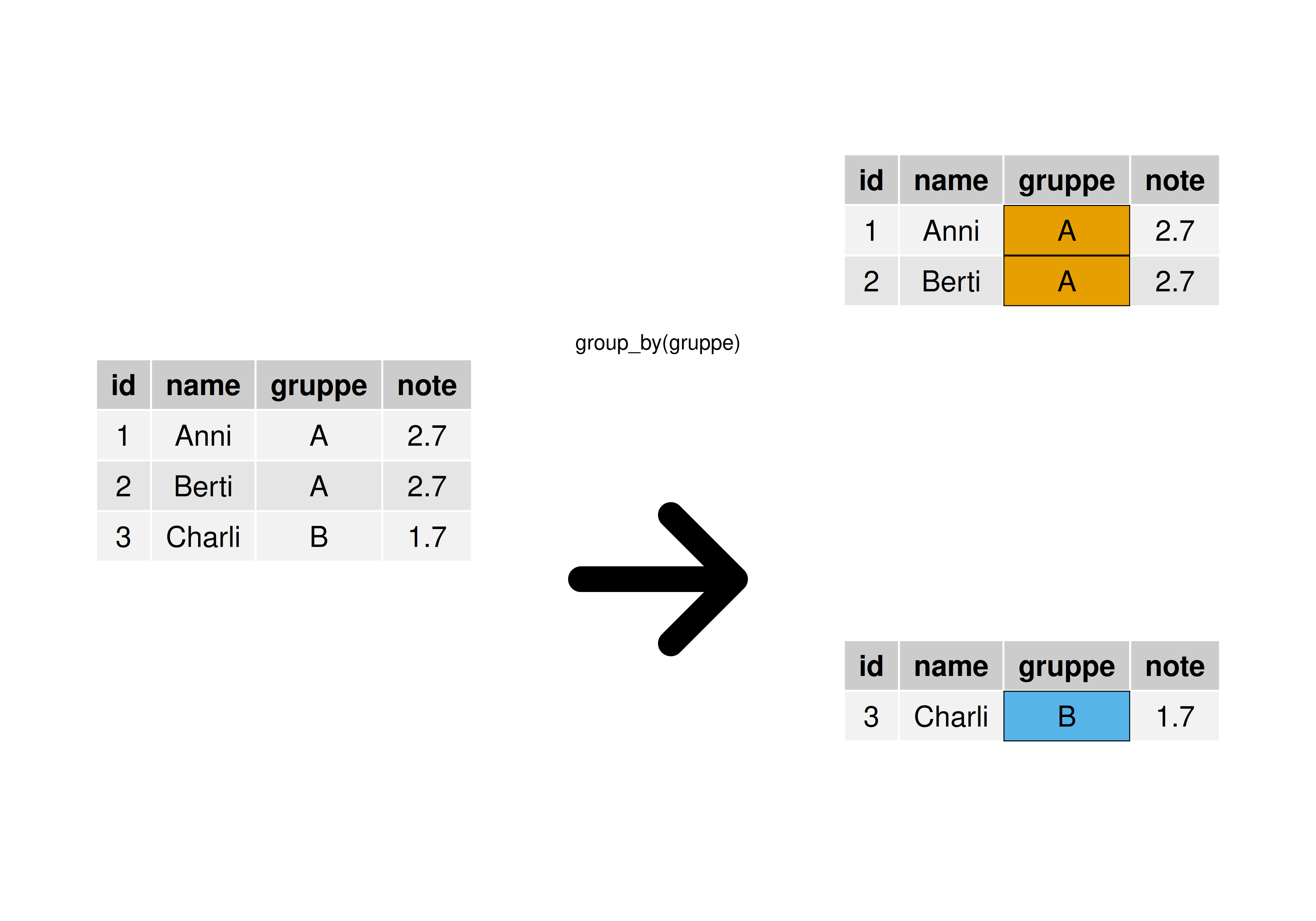 Durch das Gruppieren wird die Tabelle in “Teiltabellen” – entsprechend der Gruppen – aufgeteilt. Das sieht man der R-Tabelle aber nicht wirklich an. Aber alle nachfolgenden Berechnungen werden für jede Teiltabelle einzeln ausgeführt.
