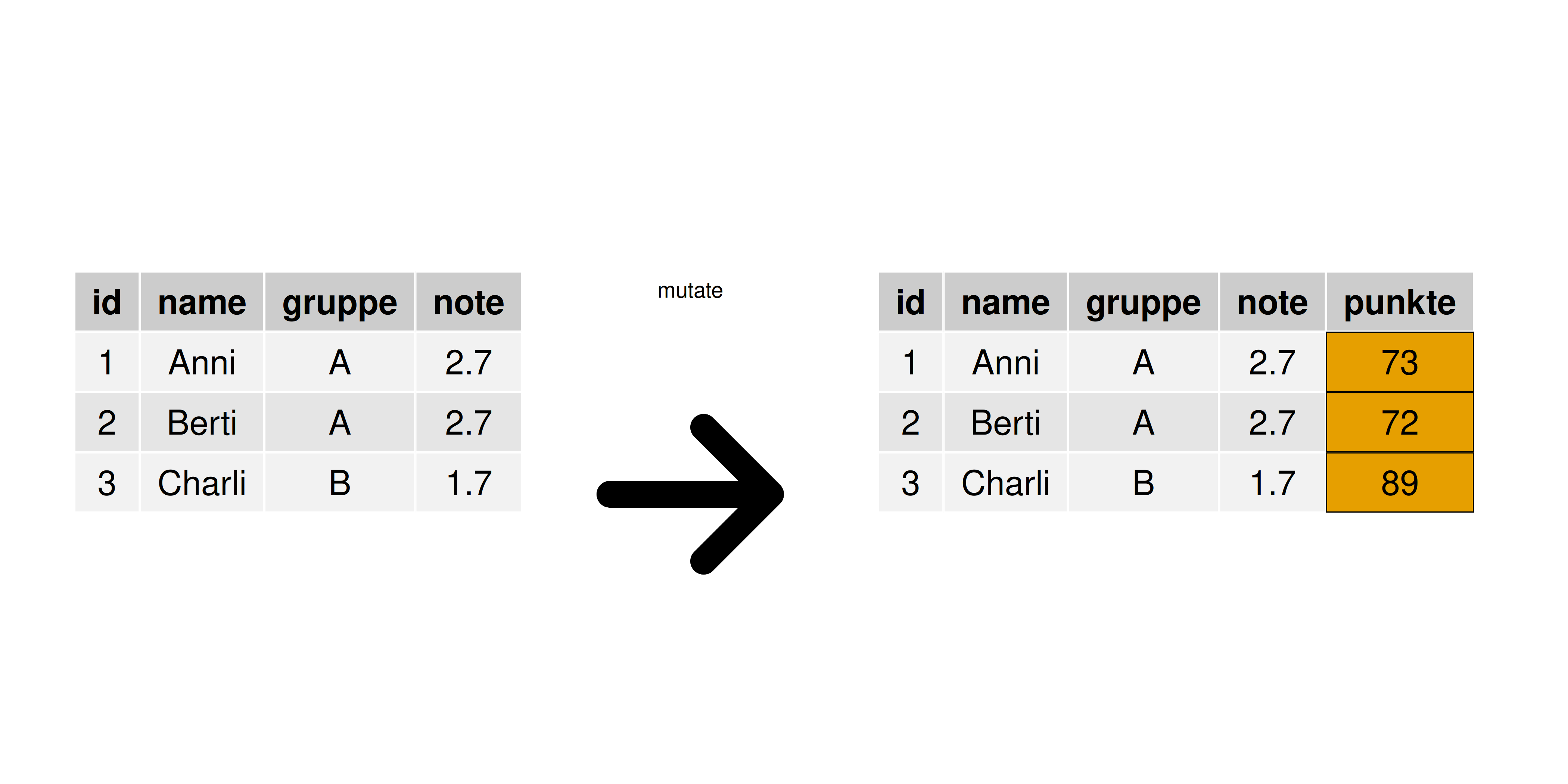 mutate() wird verwendet, um neue Spalten zu berechnen oder bestehende zu verändern. Die Anzahl der Zeilen bleibt dabei immer gleich.