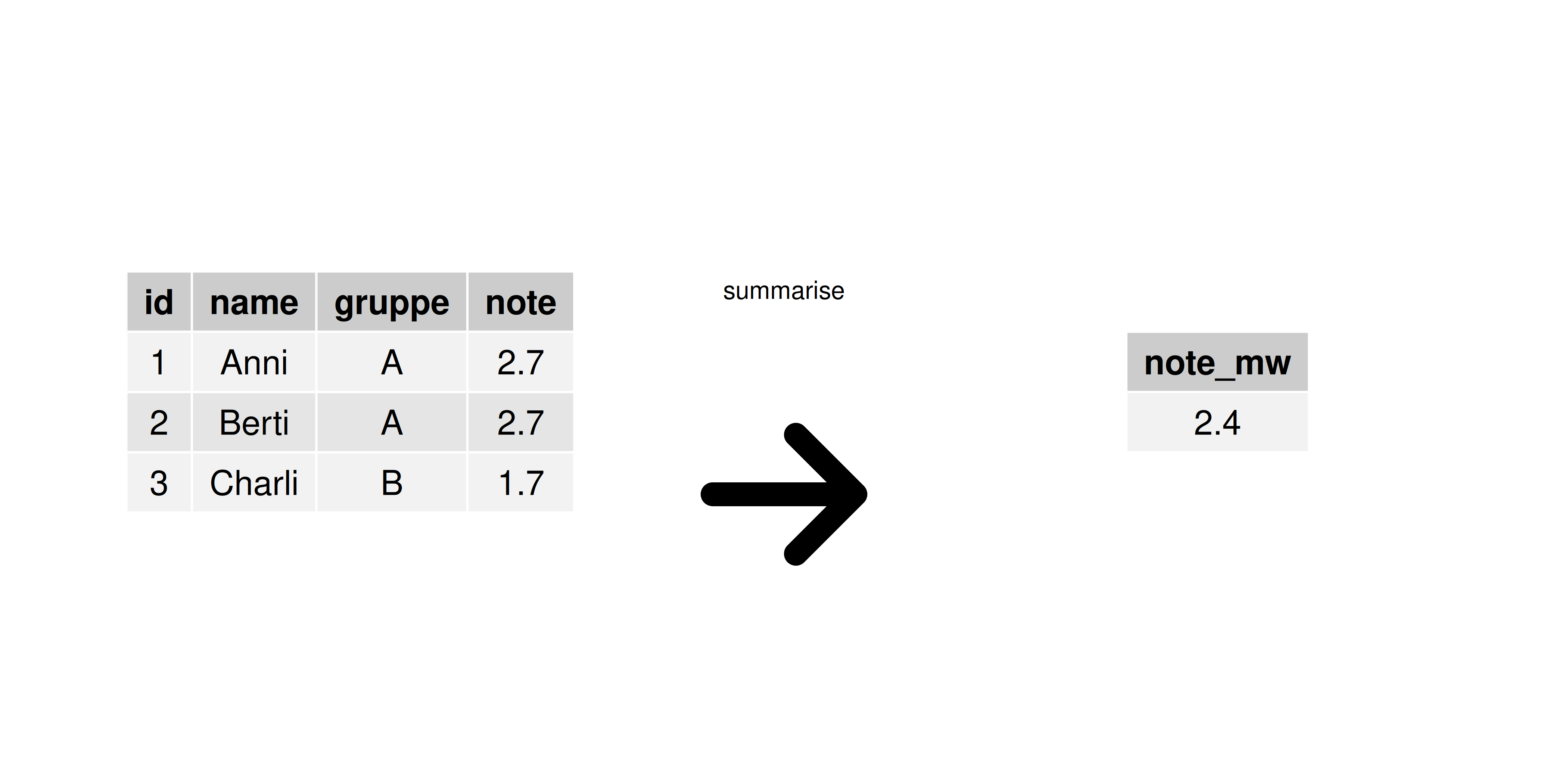 summarise() reduziert eine Gruppe von Werten auf eine einzelne Kennzahl (z. B. den Mittelwert). mutate() hingegen würde die ursprüngliche Zeilenanzahl beibehalten.