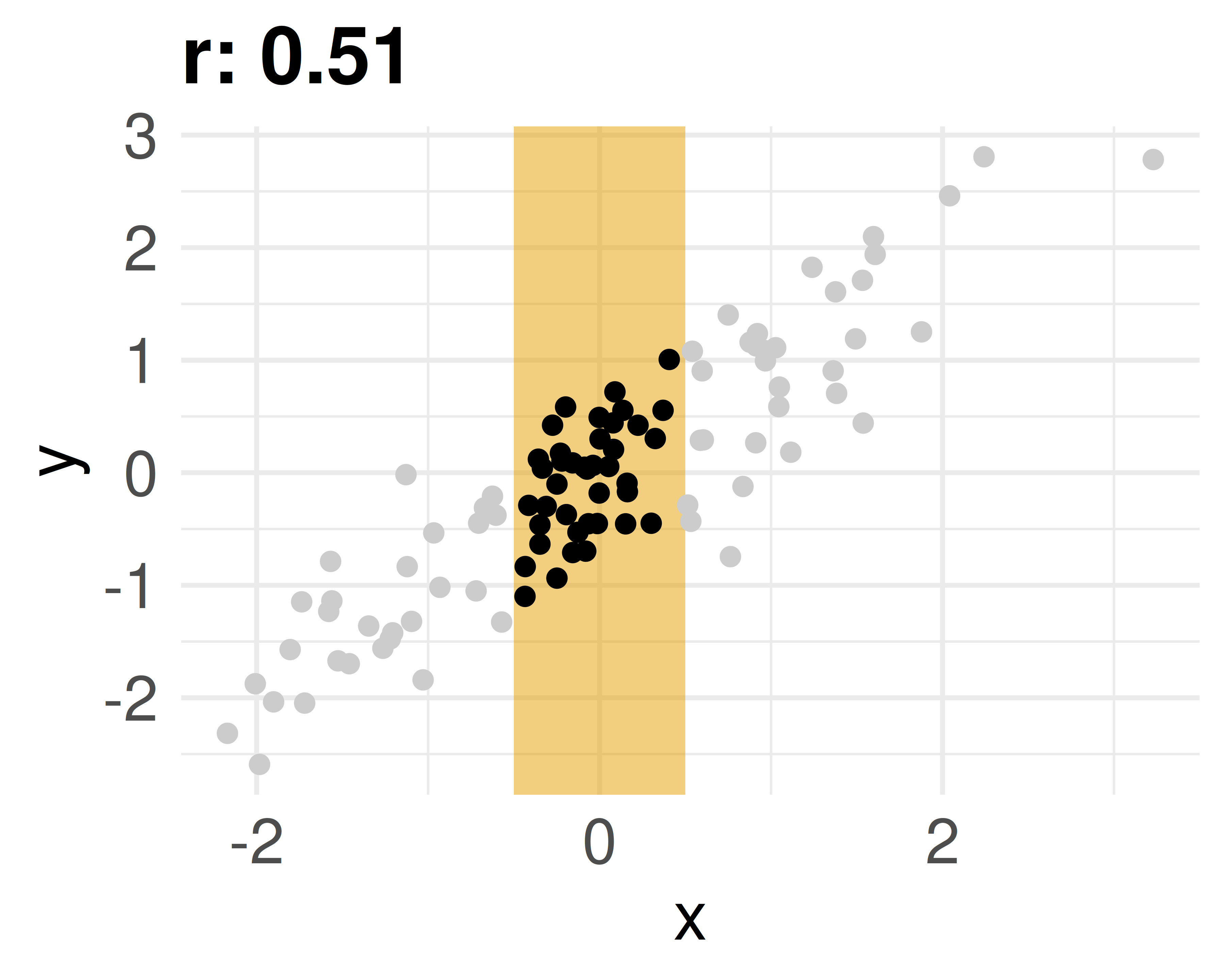 Durch (nicht-randomisierte) Einschränkung (Restriktion) der Spannweite einer (oder beider) Variablen sinkt die Stärke (der Absolutwert) einer Korrelation, vgl. Cohen et al. (2003); s. Abbildung 8.10.