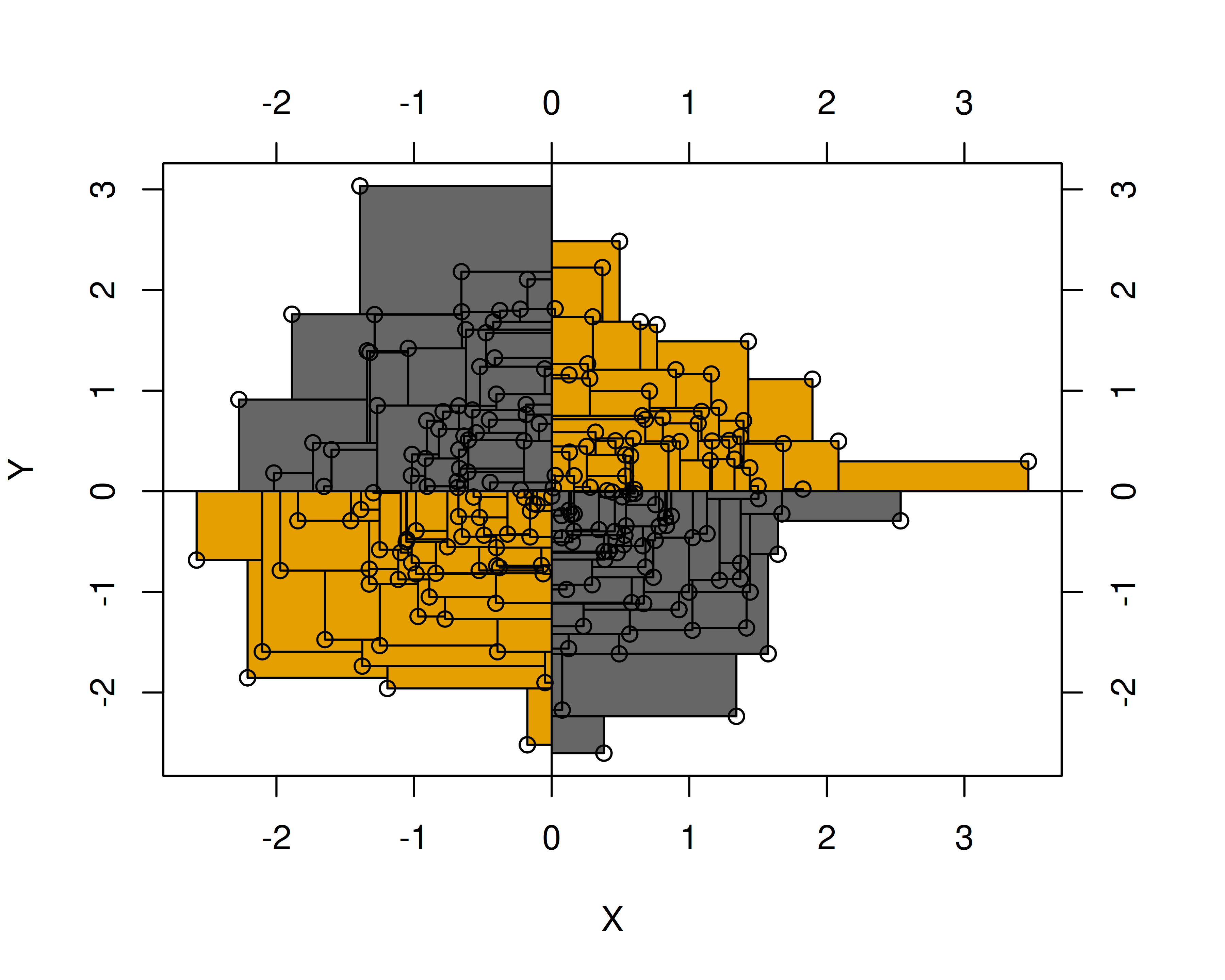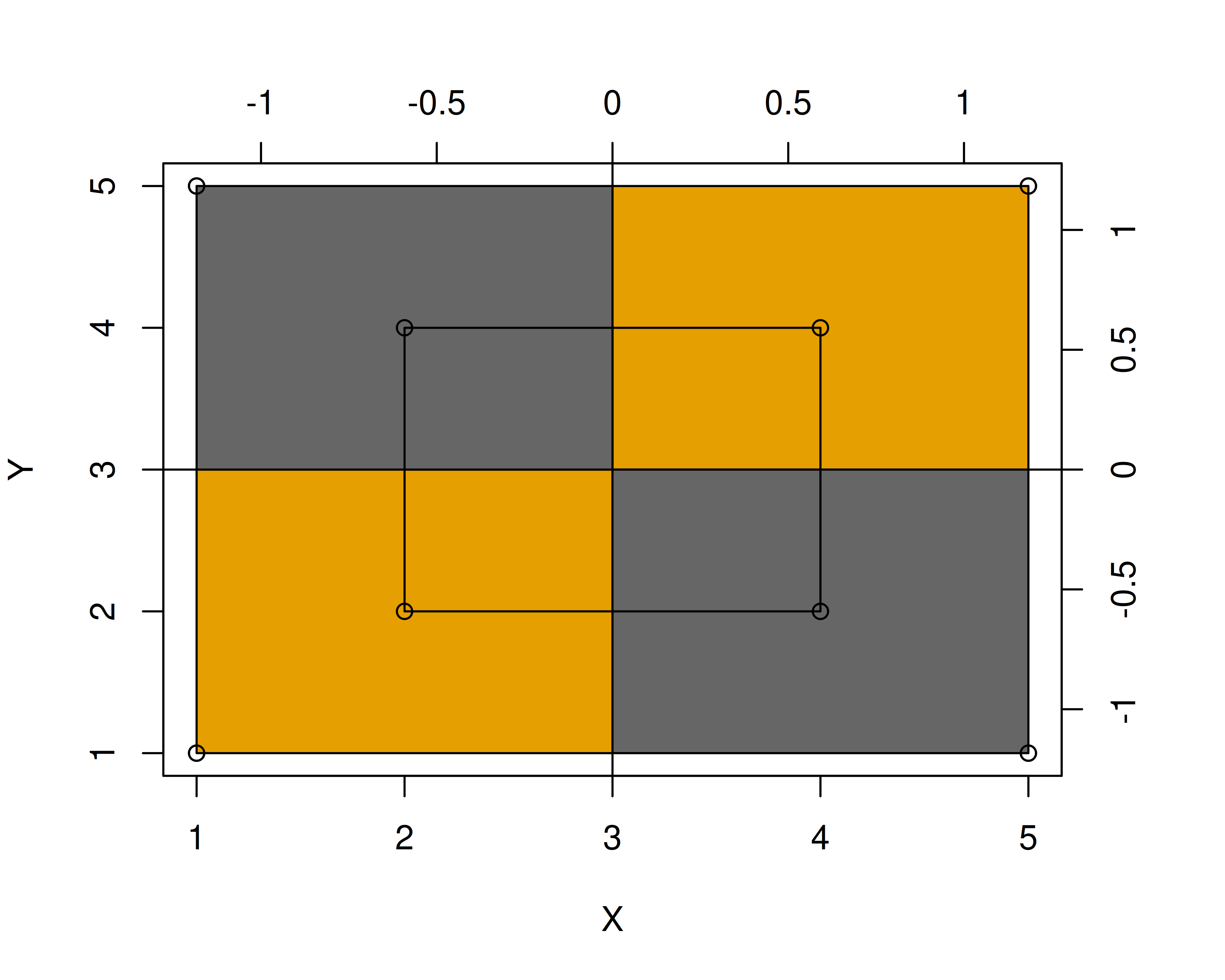 Definition 8.1 (Abweichungsrechteck) Im zweidimensionalen Fall spannt sich ein Abweichungsrechteck vom Mittelwert \(\bar{x}\) bis zum Messwert \(x_i\) und genauso für \(Y\). Wir bezeichnen mit \(dx_i\) die Distanz (Abweichung) vom Mittelwert \(\bar{x}\) bis zum Messwert \(x_i\) (und analog \(dy_i\)), also \(dx_i = x_i - \bar{x}\). Die Fläche des Abweichungsrechtecks ist dann das Produkt der Abweichungen: \(dx_i \cdot dy_i\). \(\square\)