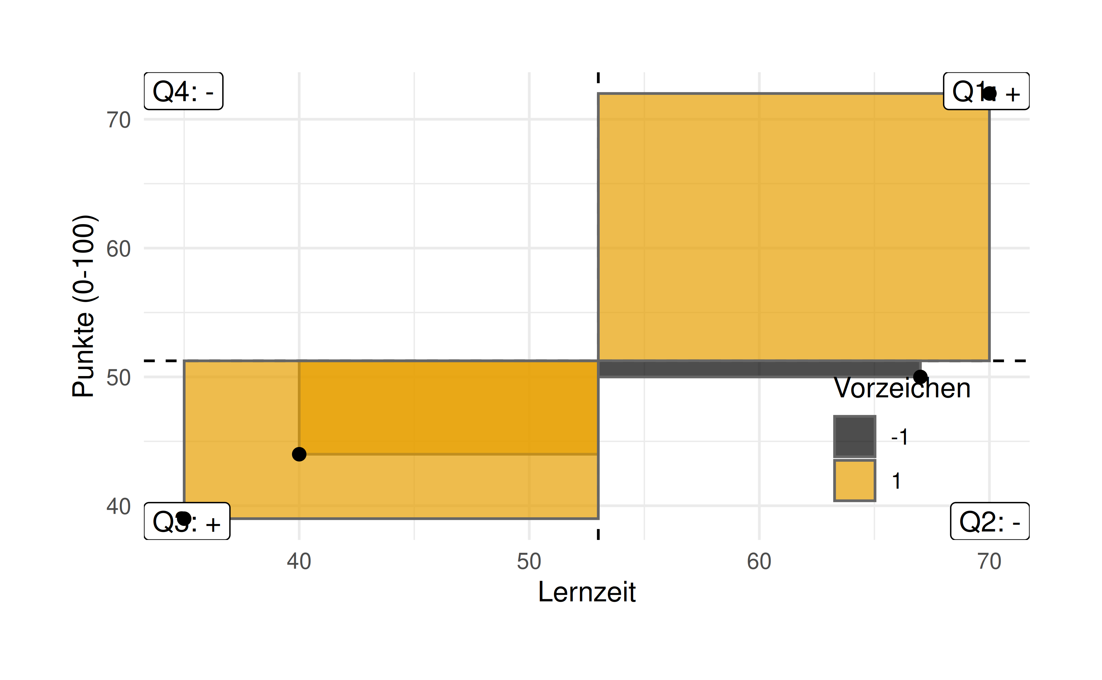 Wenn die Summe der Abweichungsrechtecke Null ist, gleichen sich positive und negative Flächen gegenseitig aus. Dies bedeutet, dass kein systematischer linearer Trend (Kovarianz = 0) vorliegt.