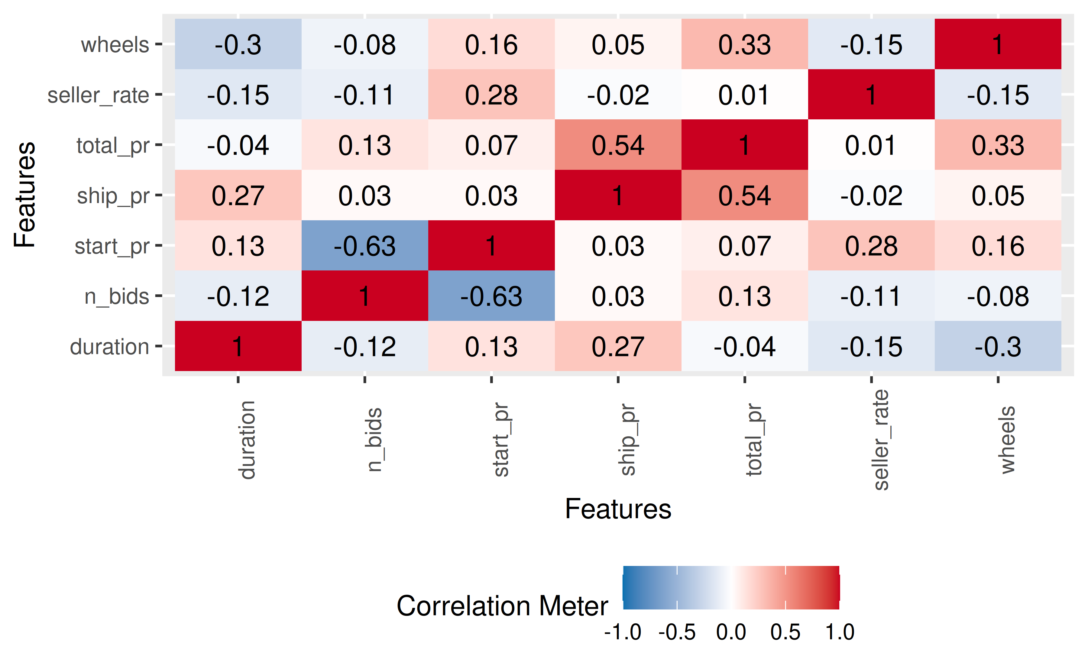 dplyr::select(duration, n_bids, start_pr, ship_pr, total_pr, seller_rate, wheels) %>%