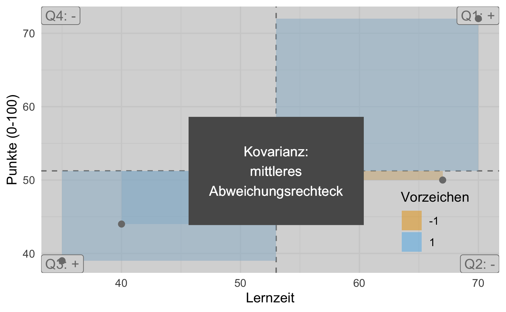 Definition 8.2 (Kovarianz) Die Kovarianz ist definiert als die Fläche des mittleren Abweichungsrechtecks. Sie ist ein Maß für die Stärke und Richtung des linearen Zusammenhangs zweier metrischer Variablen, s. Abbildung 8.5. \(\square\)