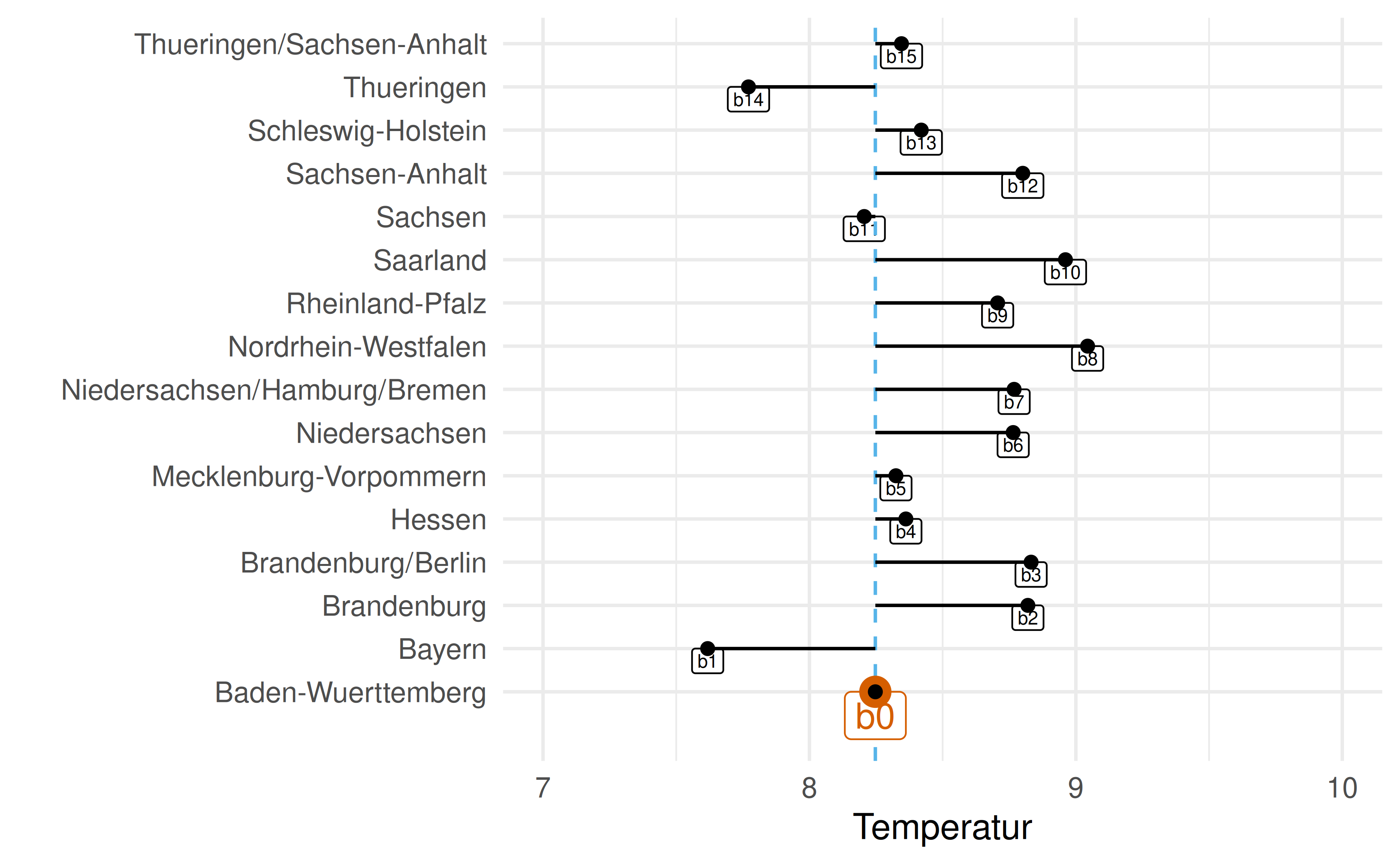 Die Interpretation eines linearen Modells mit binärer UV veranschaulicht Abbildung 10.7: Der Achsenabschnitt (\(\beta_0\)) entspricht dem Mittelwert der 1. Gruppe. Der Mittelwert der 2. Gruppe entspricht der Summe aus Achsenabschnitt und dem Koeffizienten der zweiten Gruppe. (Abbildung 10.7 zeigt nur die Daten für den Monat Juli im Bundesland Bayern, der Einfachheit und Übersichtlichkeit halber.)