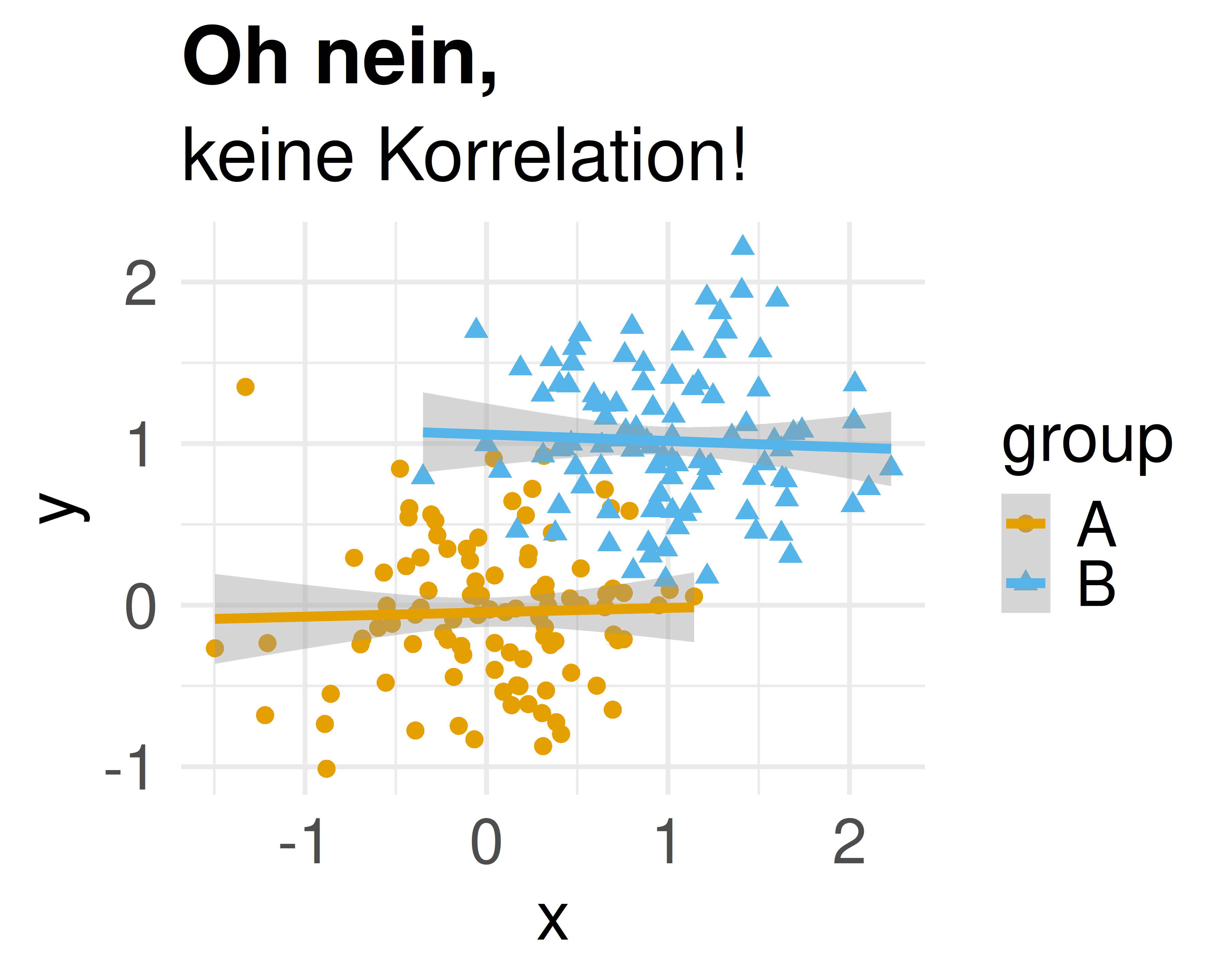 Ohne Hintergrundwissen oder ohne weitere Analysen kann nicht entschieden werden, welche Analyse – Gesamtdaten oder Subgruppen – die richtige ist. Nicht-exprimentelle Studien können zu grundverschiedenen Ergebnissen führen, je nachdem, ob weitere UV dem Modell hinzugefügt oder weggenommen werden.