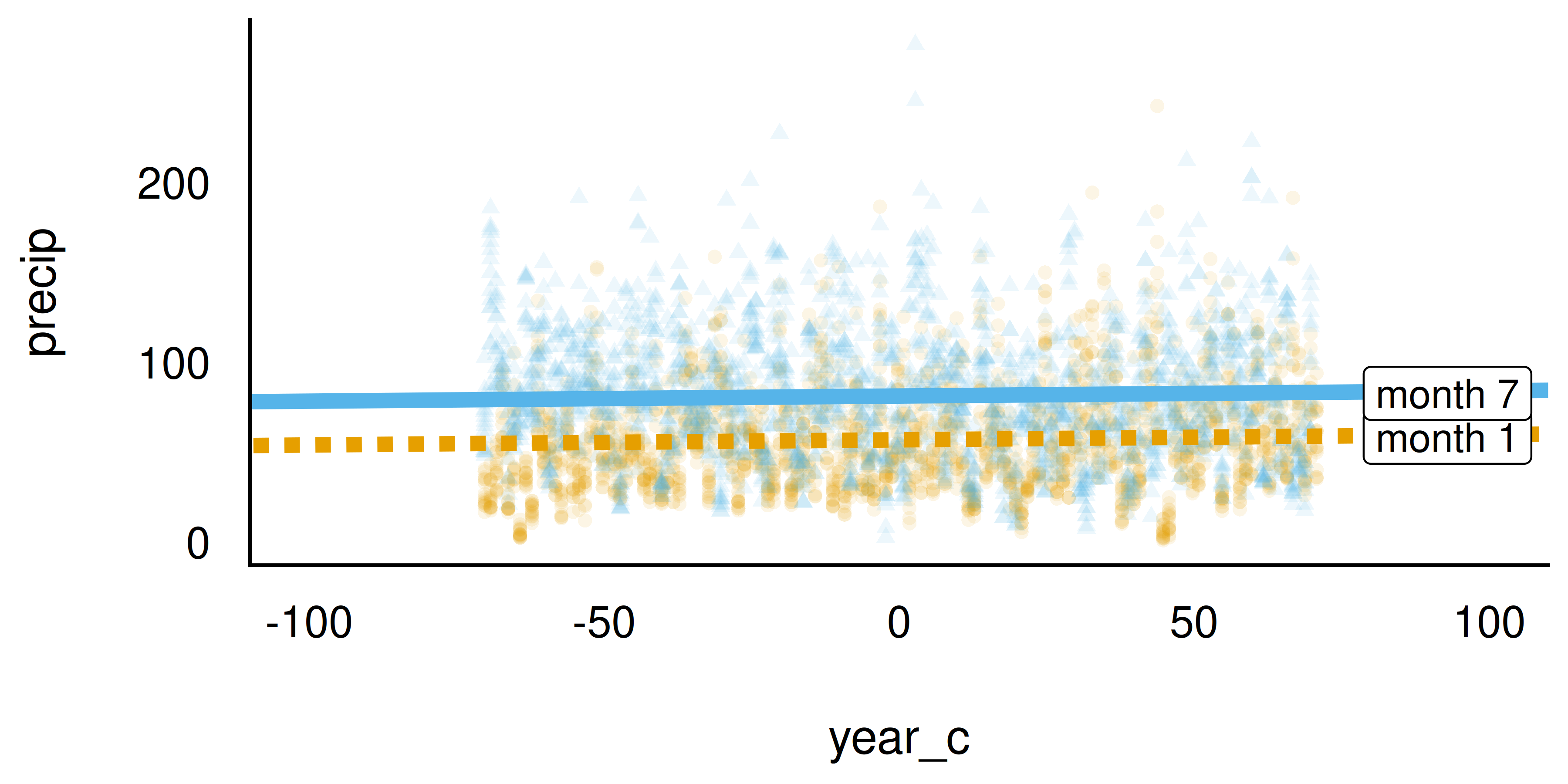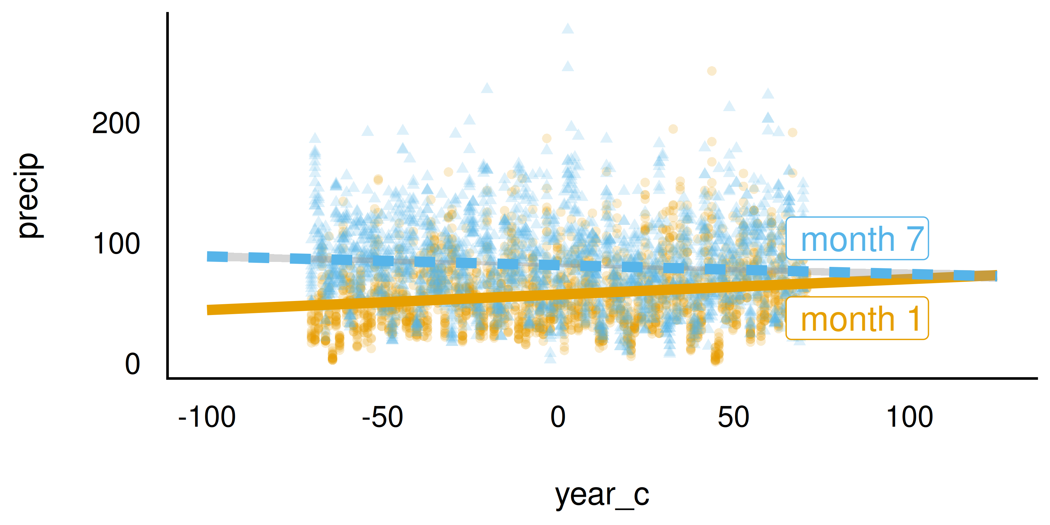 Die Steigung (d.\(\,\)h. der Regressionskoeffizient für year_c) bleibt durch das Zentrieren unverändert, nur der Achsenabschnitt ändert sich, s. Tabelle 10.3.