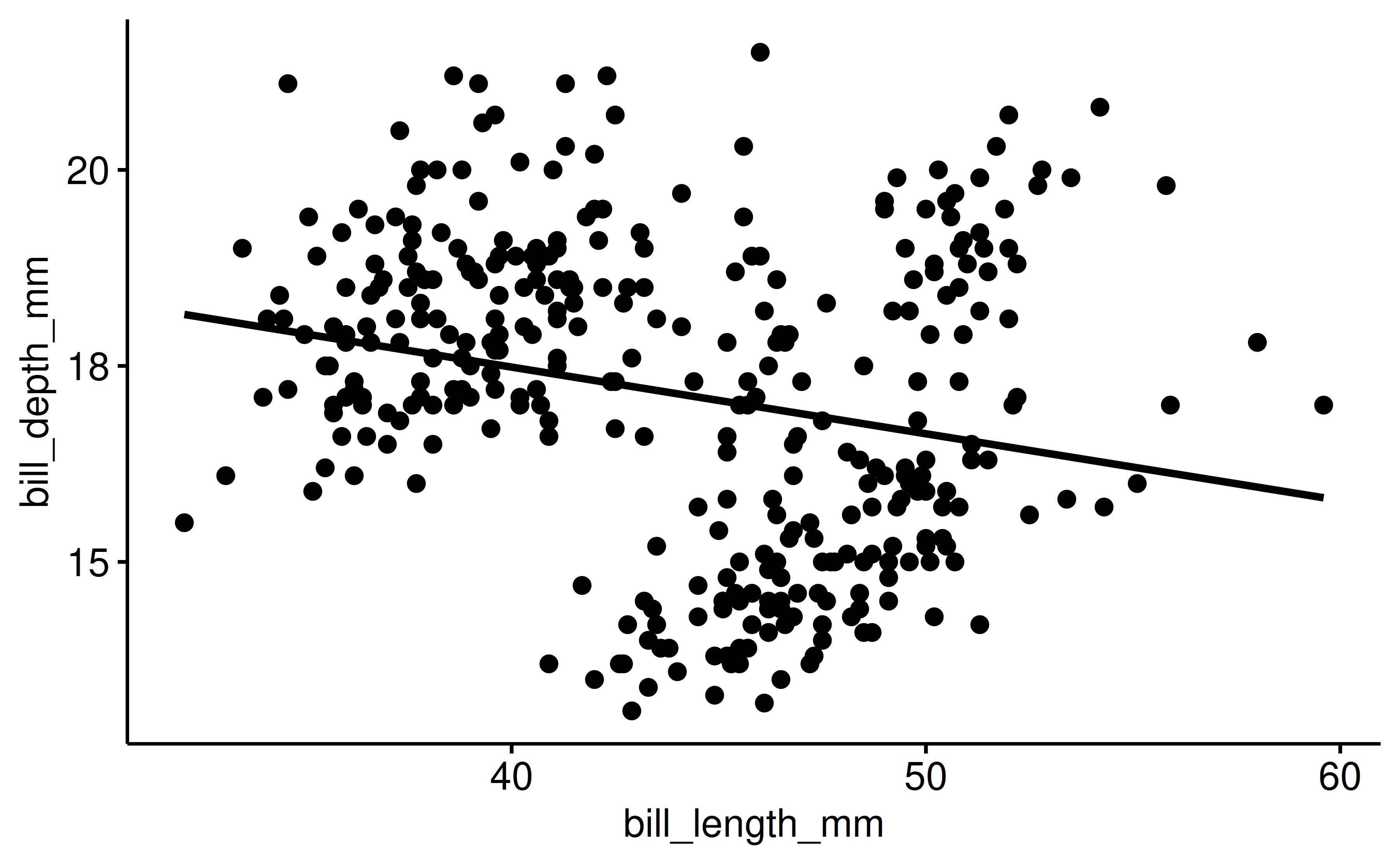 lm_ping1 <- lm(bill_depth_mm ~ bill_length_mm, data = penguins)| Parameter | Coefficient |