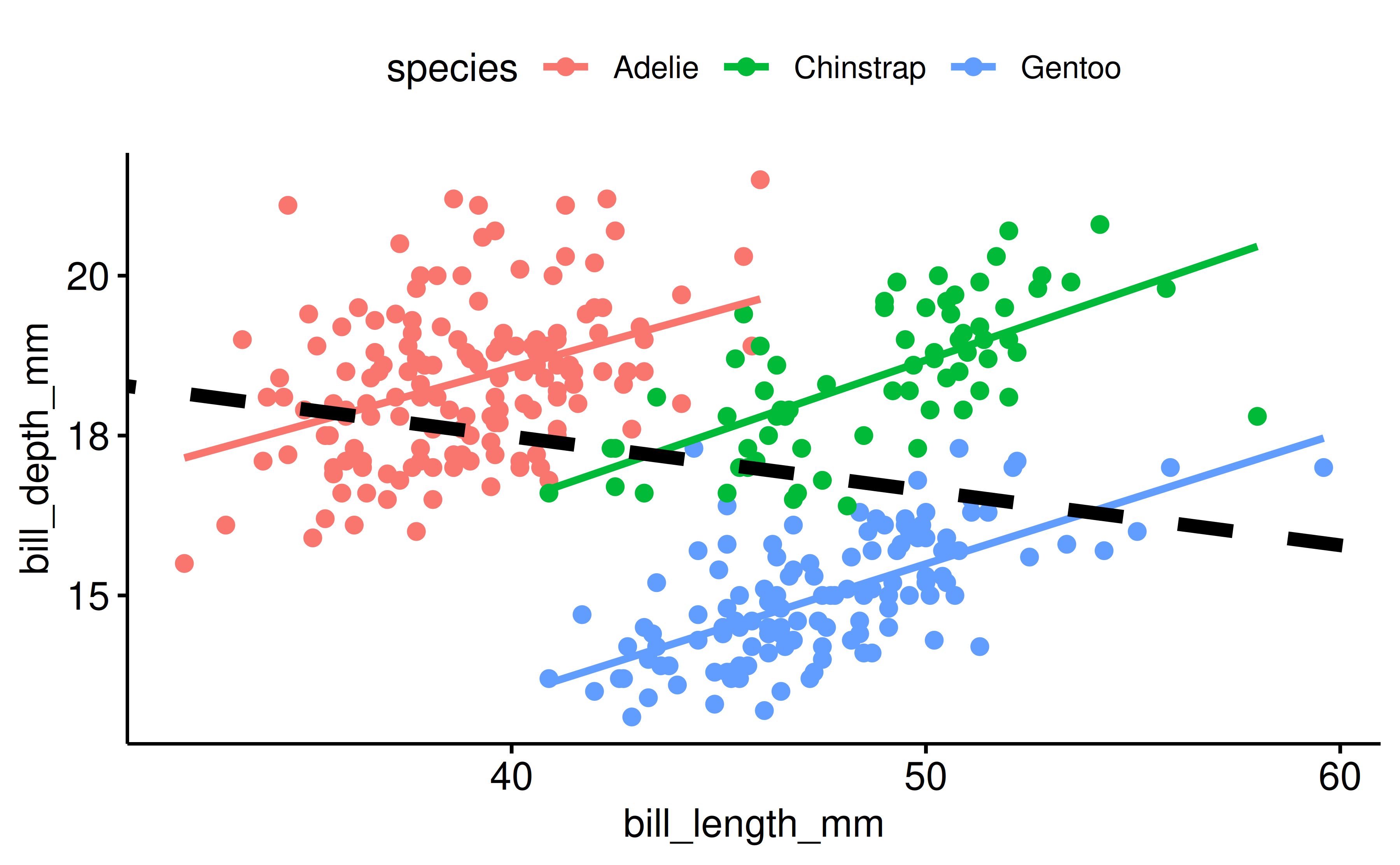 Kurz darauf veröffentlicht eine andere Forscherin auch einen Aufsatz zum gleichen Thema. Gleiche Daten. Aber mit gegenteiligem Ergebnis: Bei jeder Rasse von (untersuchten) Pinguinen gilt: Es gibt einen positiven Zusammenhang von Schnabelllänge und Schnabeltiefe, s. Abbildung 10.18.