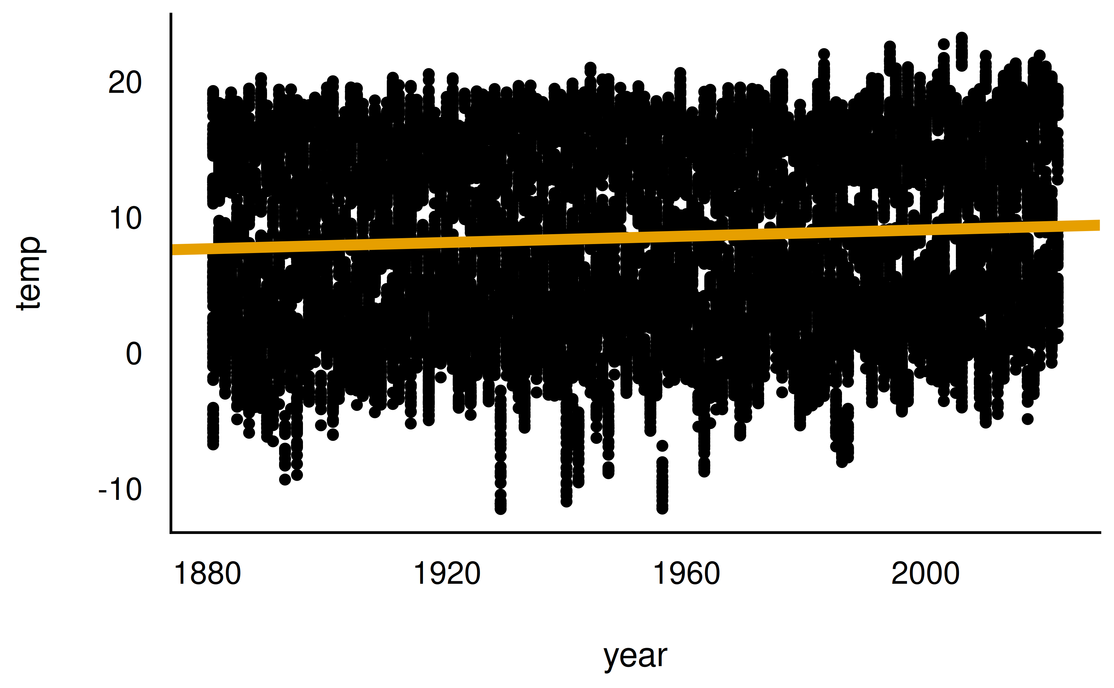 Beispiel 10.2 (Wetterdaten) Nachdem Sie einige Zeit als Datenanalyst bei dem Online-Auktionshaus gearbeitet haben, stand Ihnen der Sinn nach etwas Abwechslung. Viel Geld verdienen ist ja schon ganz nett, aber dann fiel Ihnen ein, dass Sie ja zu Generation Z gehören, und daher den schnöden Mammon nicht so hoch schätzen sollten. Sie entschließen sich, Ihre hochgeschätzten Analyse-Skills für etwas einzusetzen, das Ihnen sinnvoll erscheint: Die Analyse des Klimawandels. \(\square\)