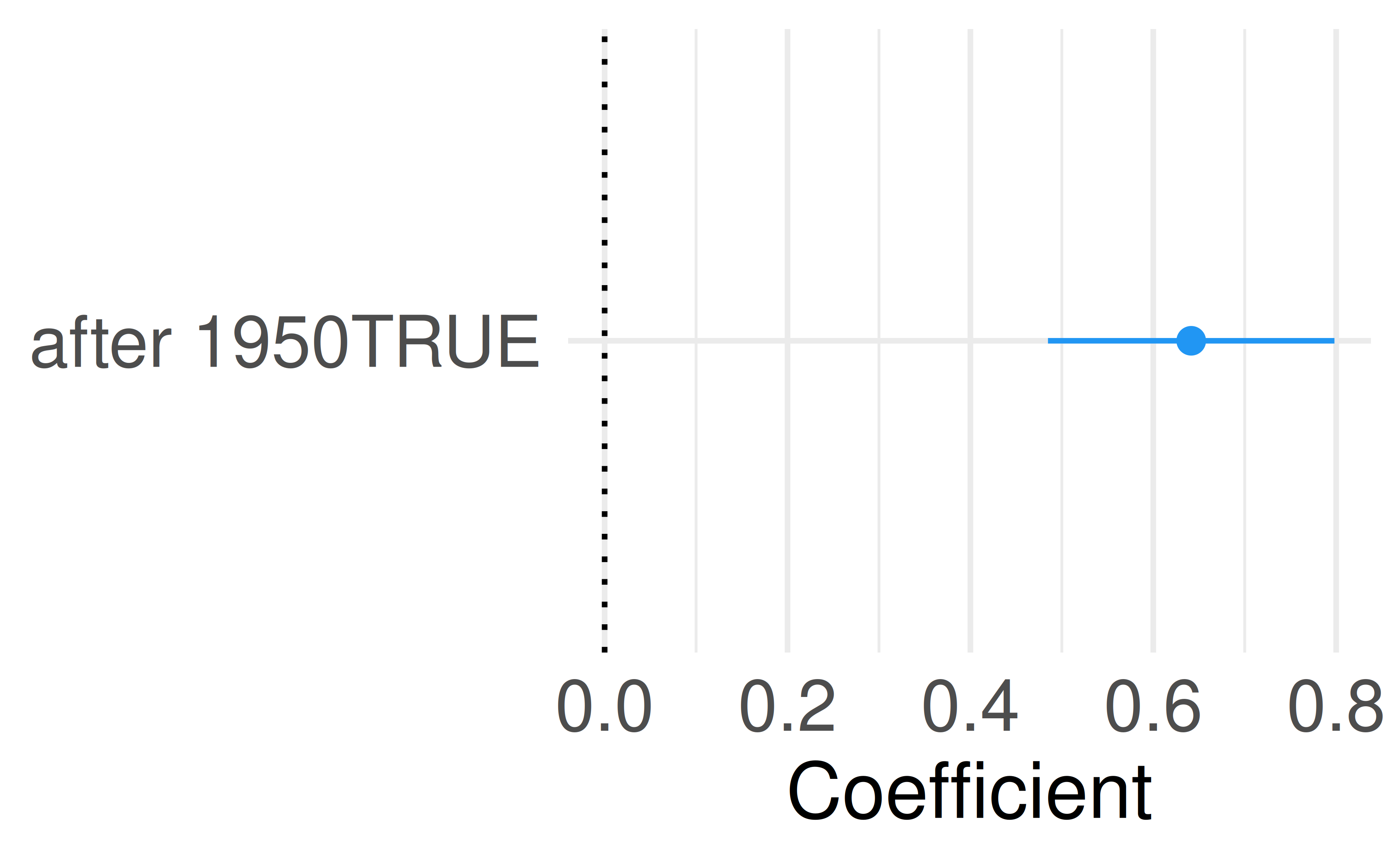 | after_1950TRUE | 0.64 | (0.48, 0.80) |