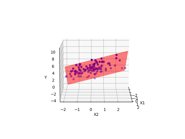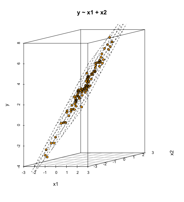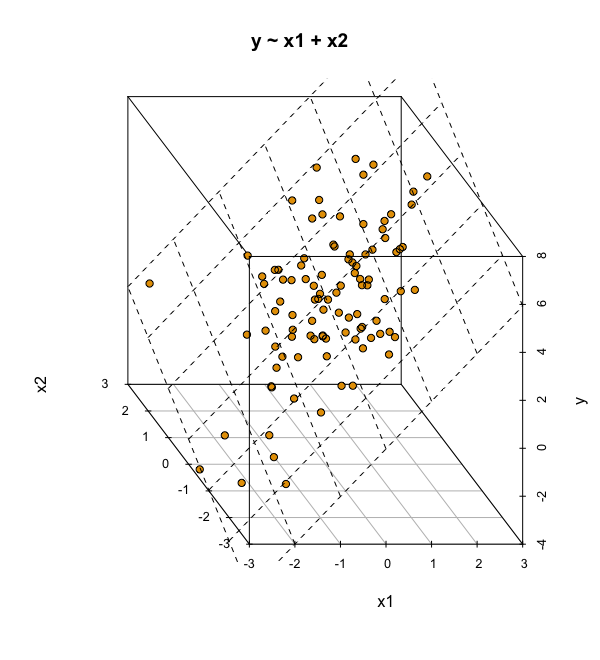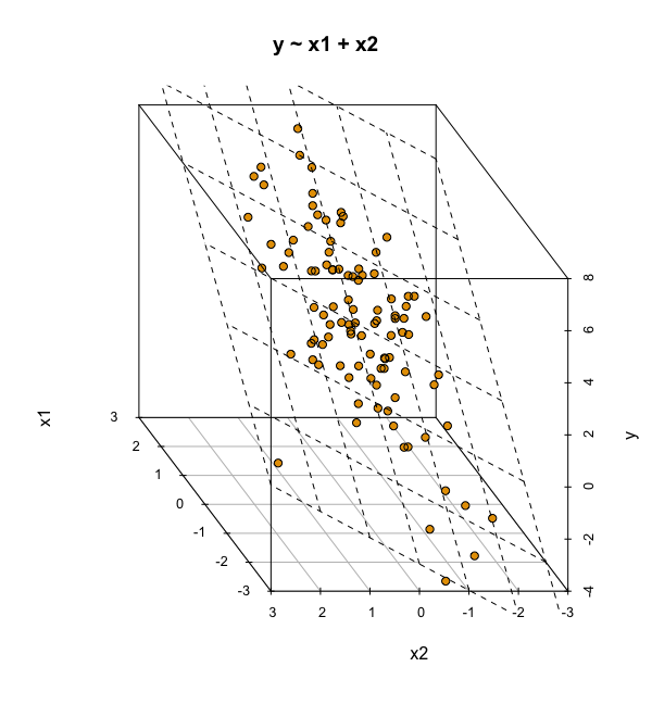 Bei zwei metrischen Prädiktoren wird für jede Kombination von x1 und x2 ein Wert vorhergesagt. Diese Werte bilden eine flache Ebene im dreidimensionalen Raum.